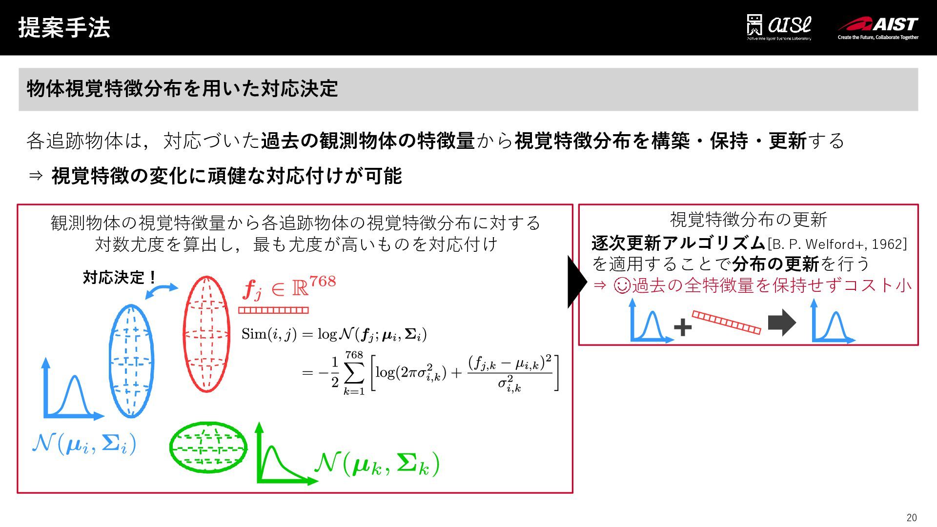 19 提案手法 19 物体視覚特徴分布を用いた対応決定 観測物体の視覚特徴量から各追跡物体の視覚特徴分布に対する 対数尤度を算出し,最も尤度が高いものを対応付け 対応決定! 各追跡物体は,対応づいた過去の観測物体の特徴量から視覚特徴分布を構築・保持・更新する ⇒ 視覚特徴の変化に頑健な対応付けが可能