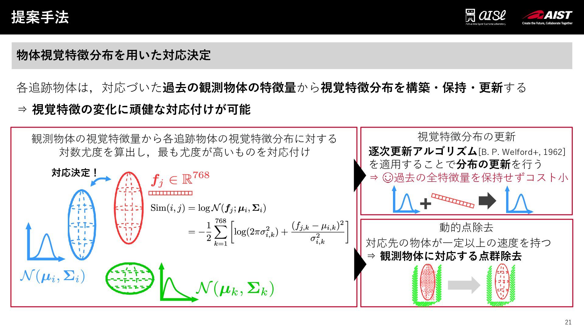 20 提案手法 20 物体視覚特徴分布を用いた対応決定 各追跡物体は,対応づいた過去の観測物体の特徴量から視覚特徴分布を構築・保持・更新する ⇒ 視覚特徴の変化に頑健な対応付けが可能 観測物体の視覚特徴量から各追跡物体の視覚特徴分布に対する 対数尤度を算出し,最も尤度が高いものを対応付け 視覚特徴分布の更新