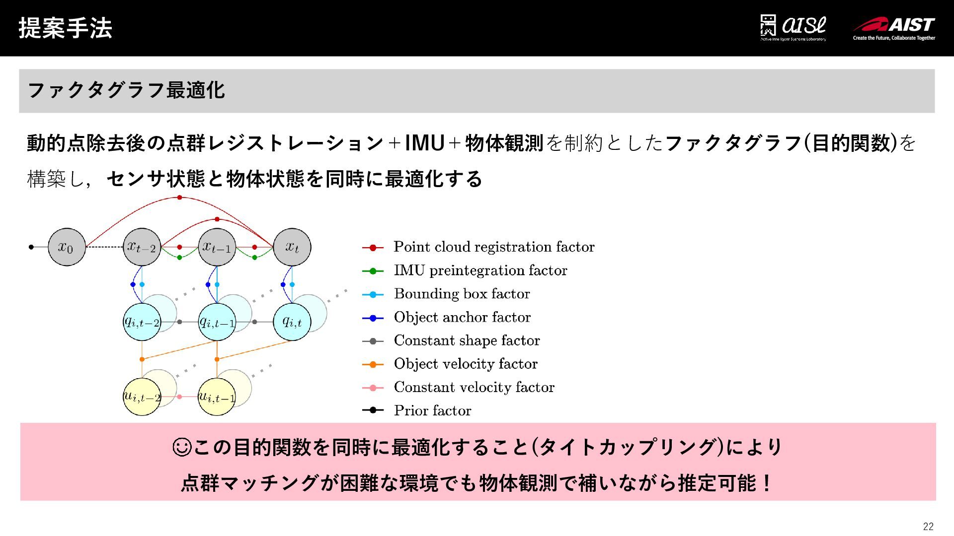 22 提案手法 22 ファクタグラフ最適化 動的点除去後の点群レジストレーション+IMU+物体観測を制約としたファクタグラフ(目的関数)を 構築し,センサ状態と物体状態を同時に最適化する この目的関数を同時に最適化すること(タイトカップリング)により 点群マッチングが困難な環境でも物体観測で補いながら推定可能!