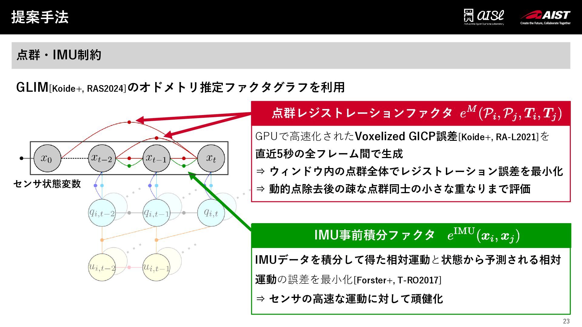 RA-L2021]を 直近5秒の全フレーム間で生成 ⇒ ウィンドウ内の点群全体でレジストレーション誤差を最小化 ⇒ 動的点除去後の疎な点群同士の小さな重なりまで評価 IMUデータを積分して得た相対運動と状態から予測される相対 運動の誤差を最小化[Forster+, T-RO2017] ⇒ センサの高速な運動に対して頑健化 センサ状態変数