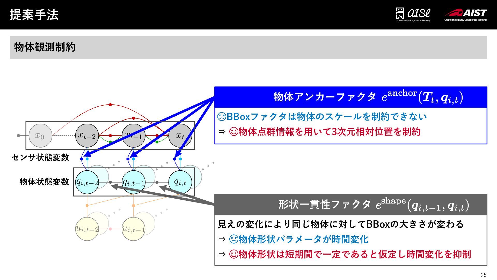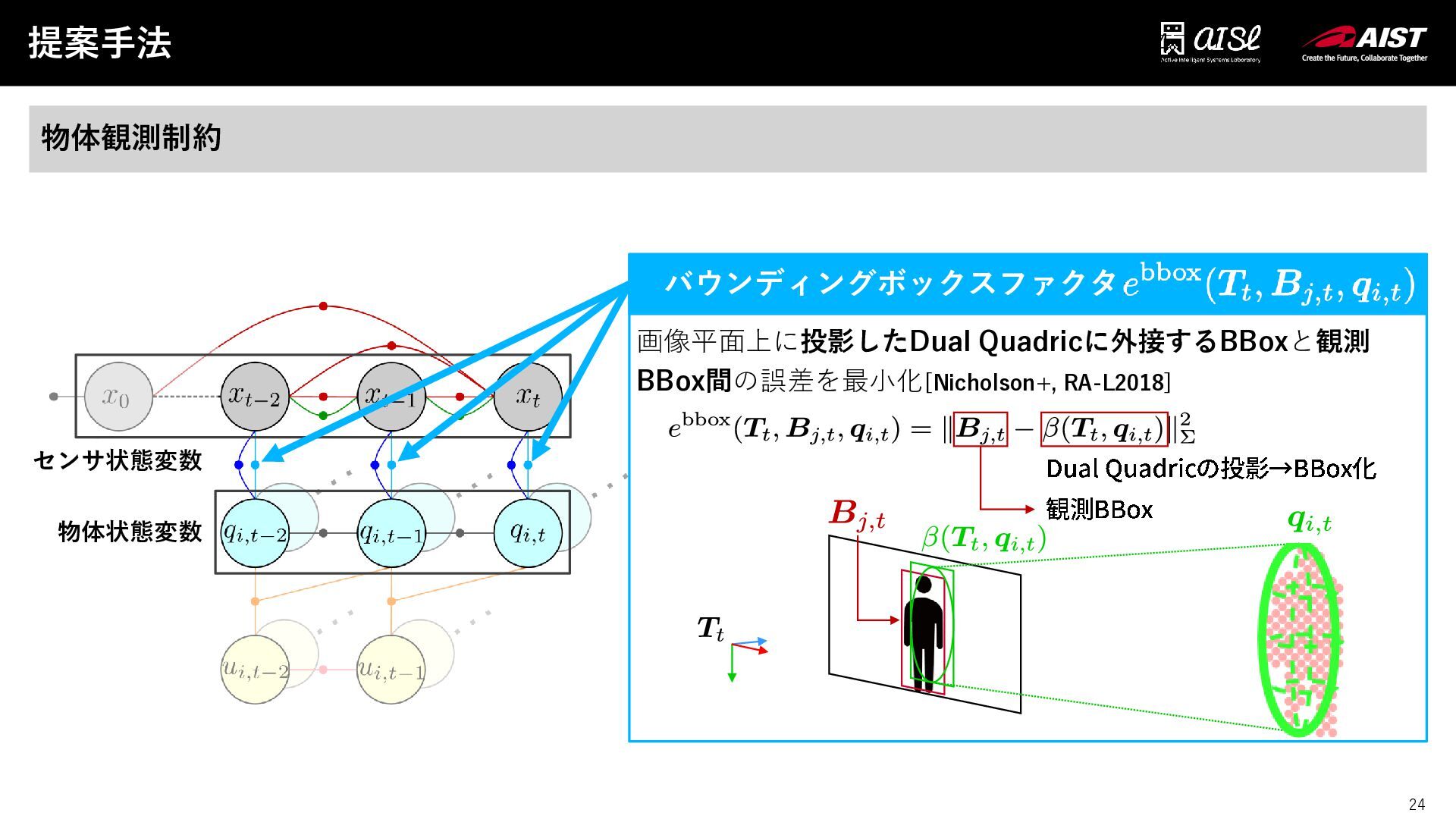 24 バウンディングボックスファクタあああああああああ 提案手法 24 物体観測制約 画像平面上に投影したDual Quadricに外接するBBoxと観測 BBox間の誤差を最小化[Nicholson+, RA-L2018] Dual