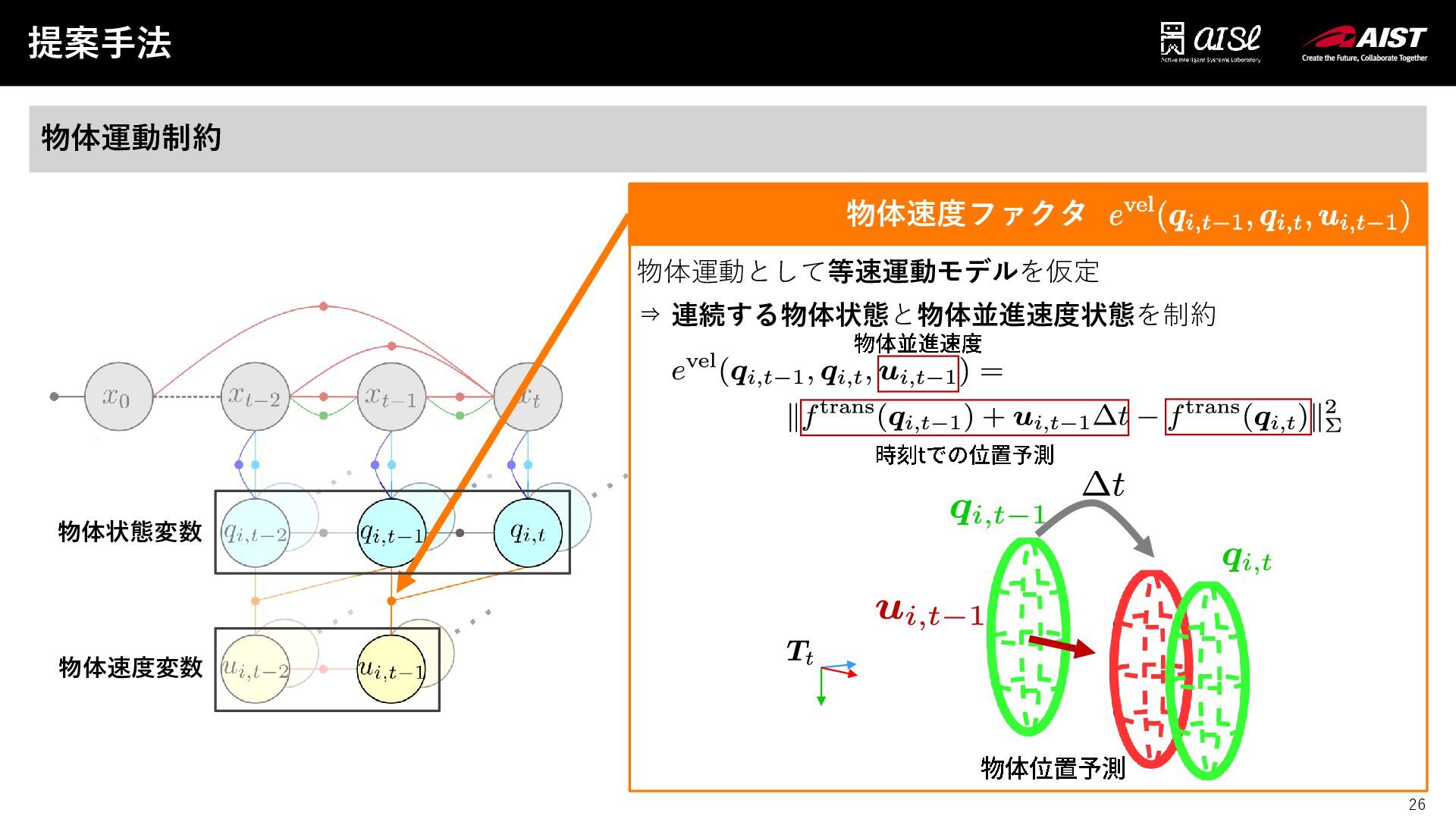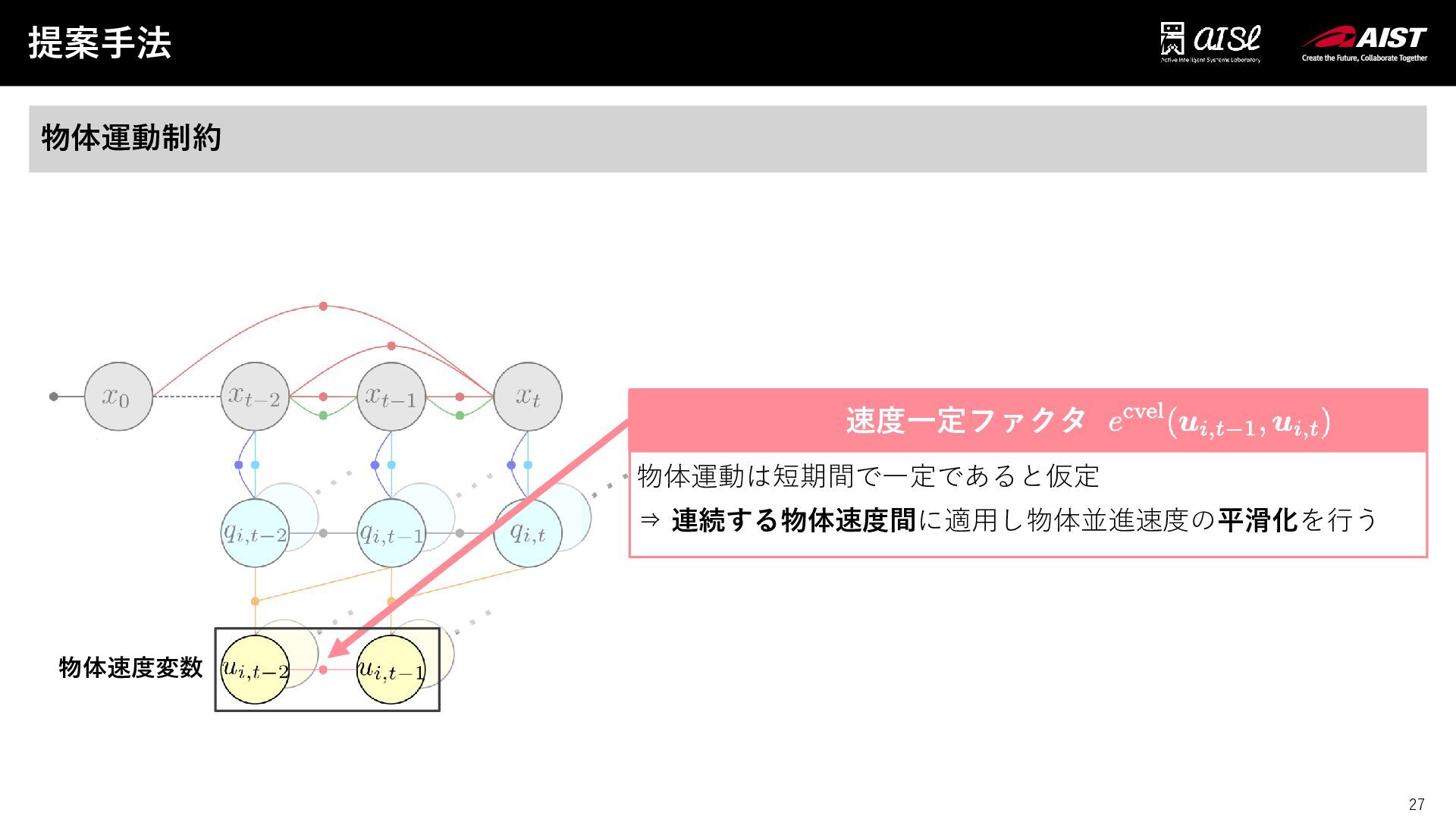 26 物体速度ファクタああああ 提案手法 26 物体運動制約 物体運動として等速運動モデルを仮定 ⇒ 連続する物体状態と物体並進速度状態を制約 物体並進速度 時刻tでの位置予測