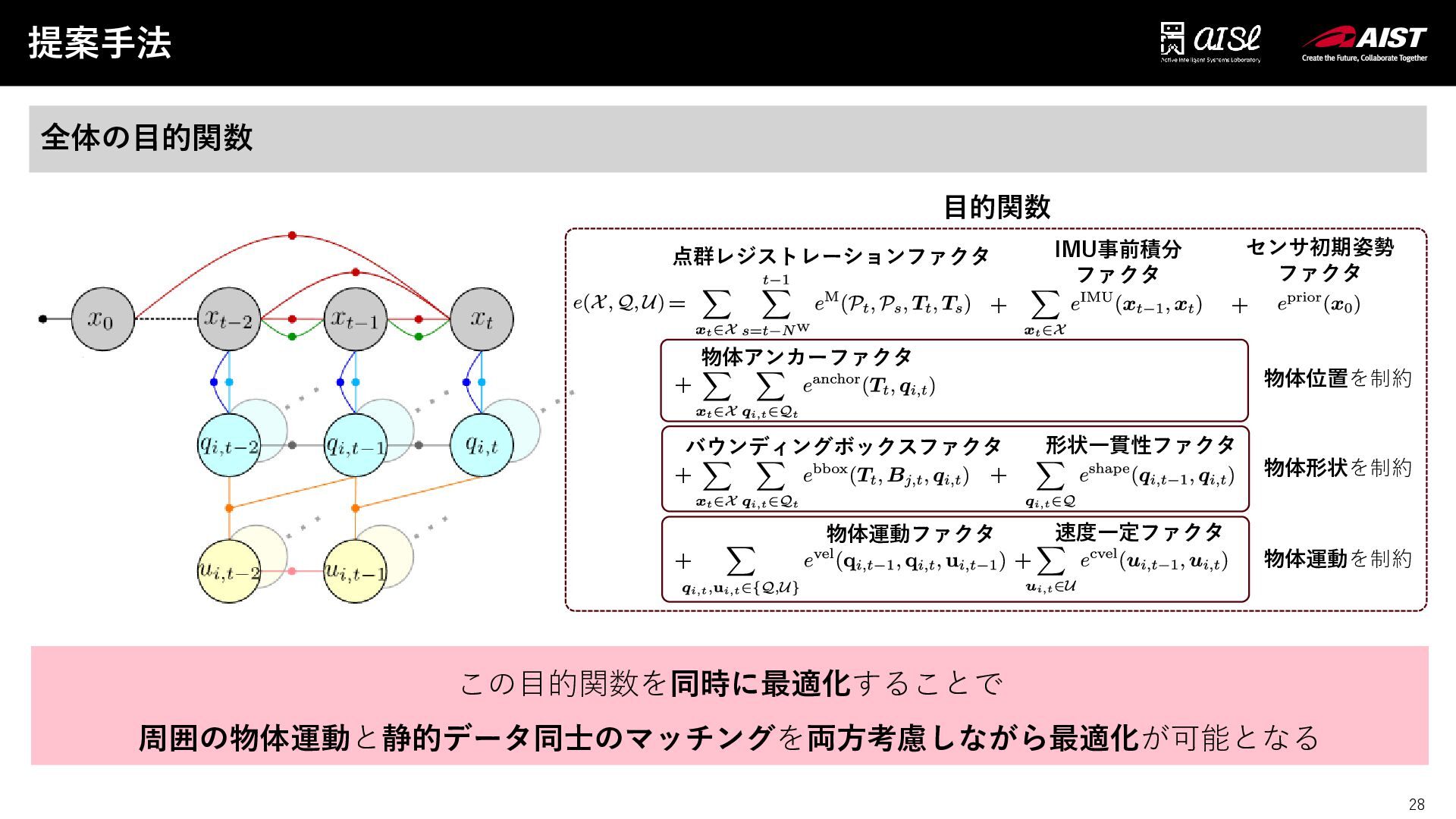 + 点群レジストレーションファクタ IMU事前積分 ファクタ センサ初期姿勢 ファクタ 物体位置を制約 物体形状を制約 物体運動を制約 = 目的関数 バウンディングボックスファクタ 形状一貫性ファクタ 物体運動ファクタ 速度一定ファクタ この目的関数を同時に最適化することで 周囲の物体運動と静的データ同士のマッチングを両方考慮しながら最適化が可能となる 物体アンカーファクタ