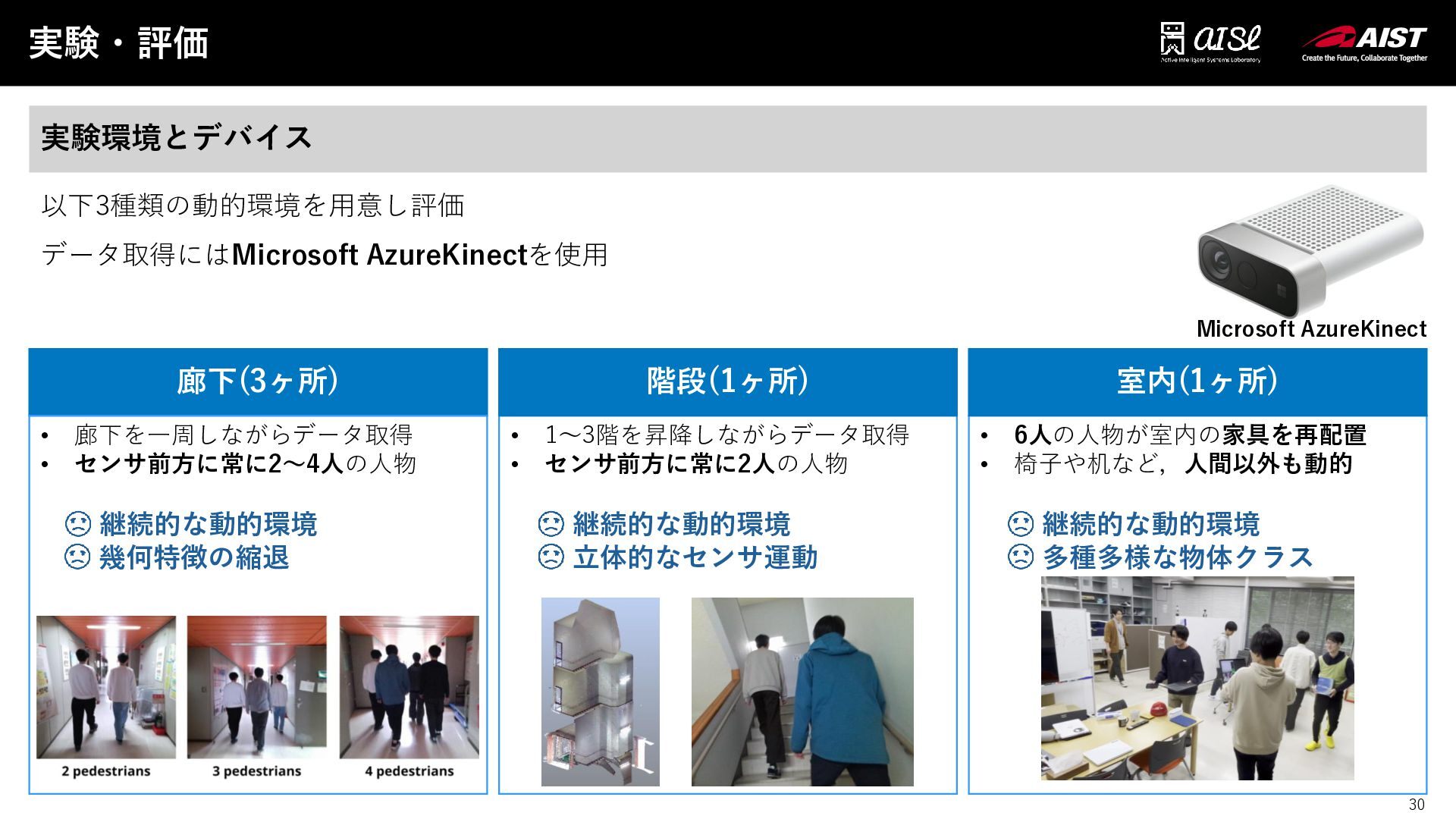 幾何特徴の縮退 室内(1ヶ所) 階段(1ヶ所) • 1~3階を昇降しながらデータ取得 • センサ前方に常に2人の人物 継続的な動的環境 立体的なセンサ運動 • 6人の人物が室内の家具を再配置 • 椅子や机など,人間以外も動的 継続的な動的環境 多種多様な物体クラス 以下3種類の動的環境を用意し評価 データ取得にはMicrosoft AzureKinectを使用 Microsoft AzureKinect