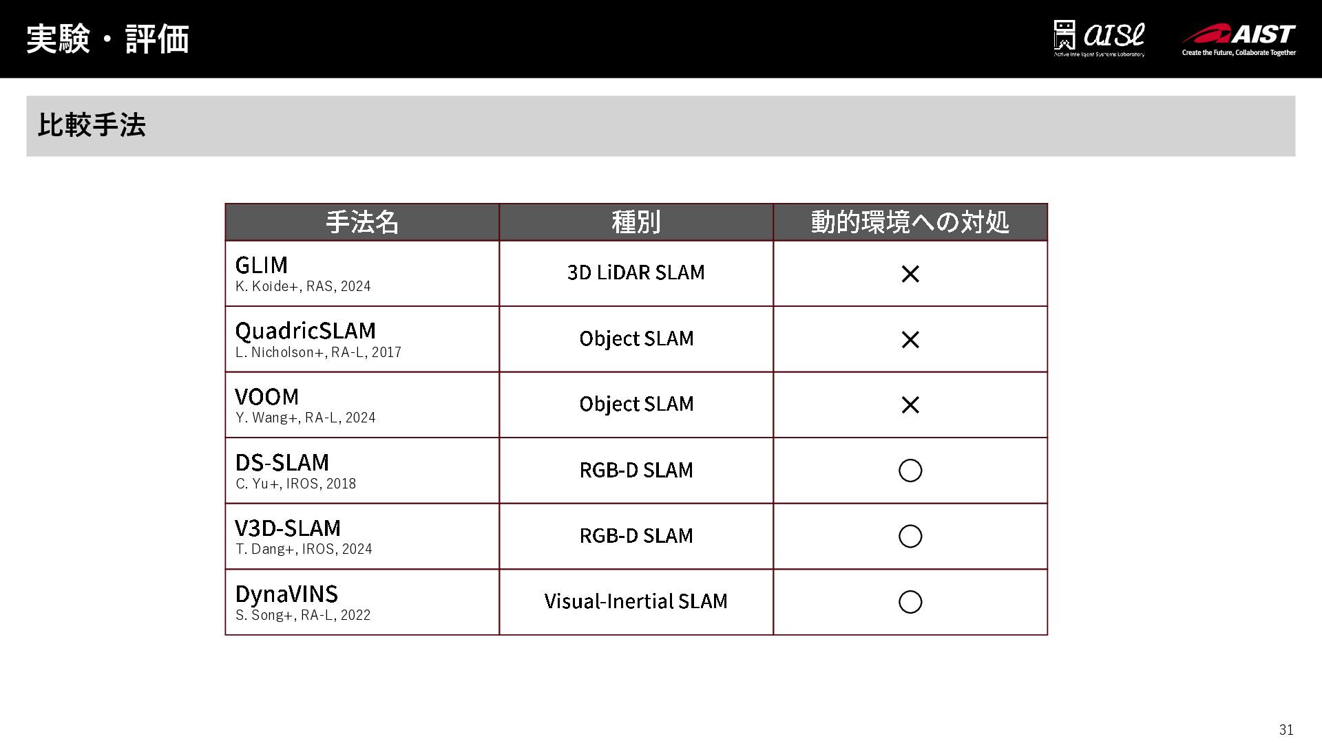 31 実験・評価 31 比較手法 手法名 種別 動的環境への対処 GLIM K. Koide+,