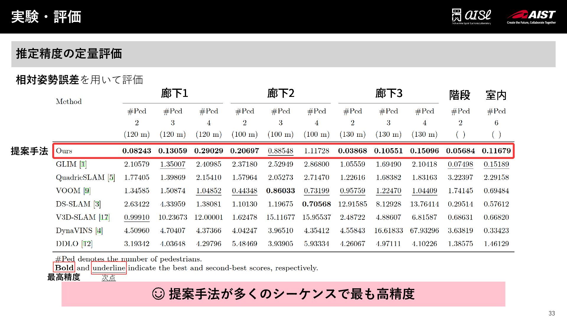 33 実験・評価 33 推定精度の定量評価 相対姿勢誤差を用いて評価 廊下1 廊下2 廊下3 階段 提案手法が多くのシーケンスで最も高精度