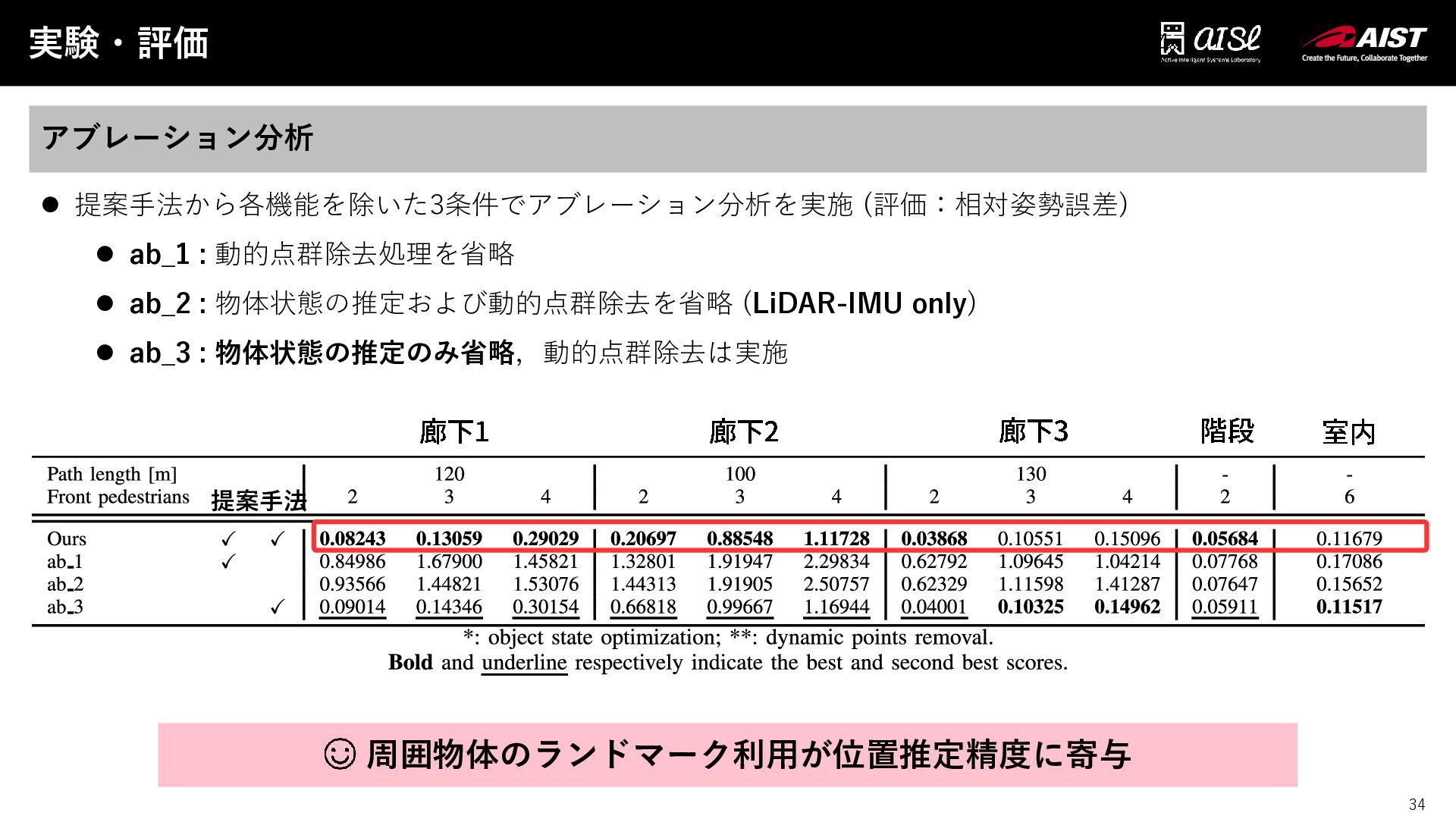 34 実験・評価 34 アブレーション分析 ⚫ 提案手法から各機能を除いた3条件でアブレーション分析を実施 (評価:相対姿勢誤差) ⚫ ab_1 :