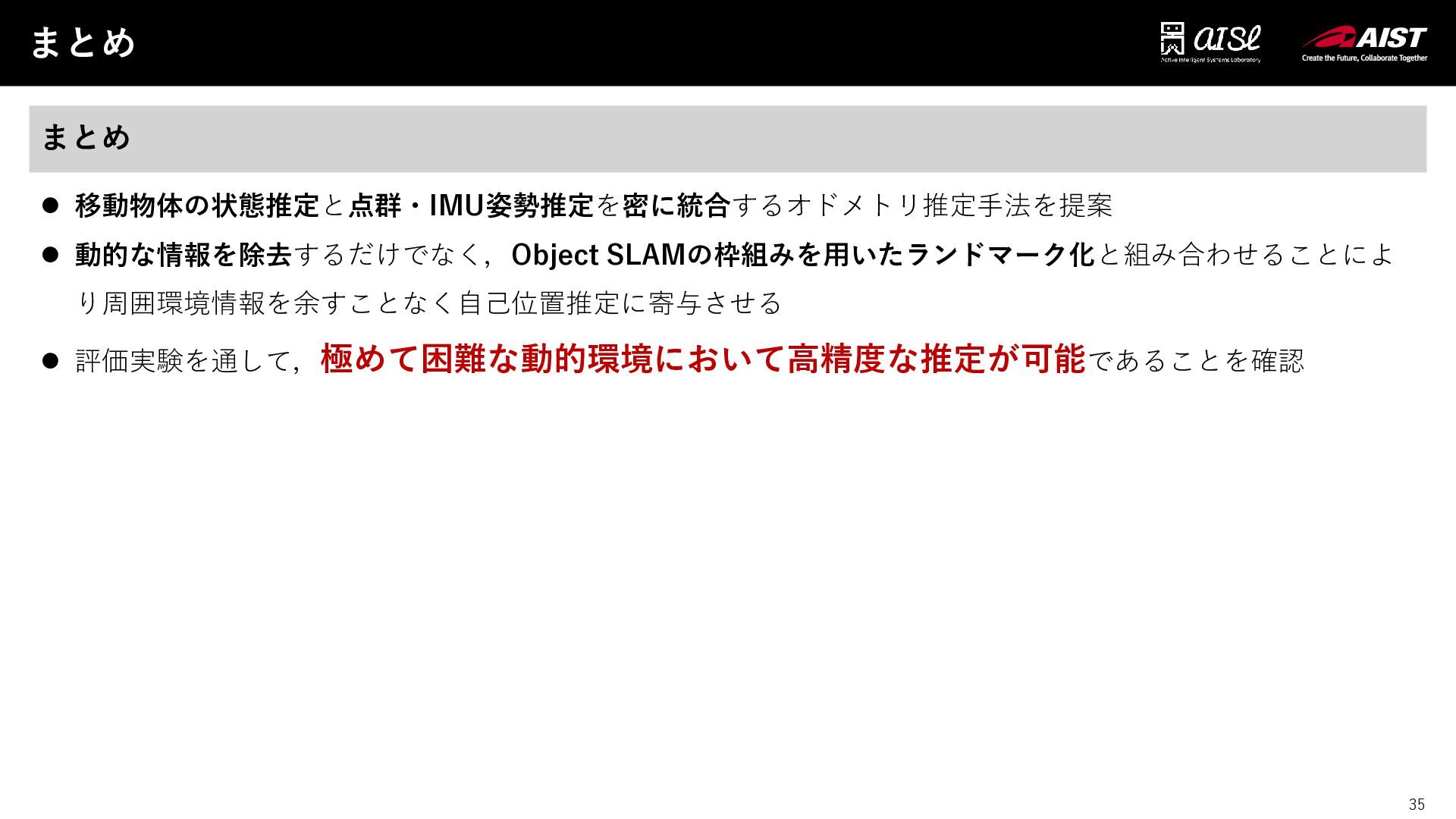 35 まとめ 35 まとめ ⚫ 移動物体の状態推定と点群・IMU姿勢推定を密に統合するオドメトリ推定手法を提案 ⚫ 動的な情報を除去するだけでなく,Object SLAMの枠組みを用いたランドマーク化と組み合わせることによ り周囲環境情報を余すことなく自己位置推定に寄与させる