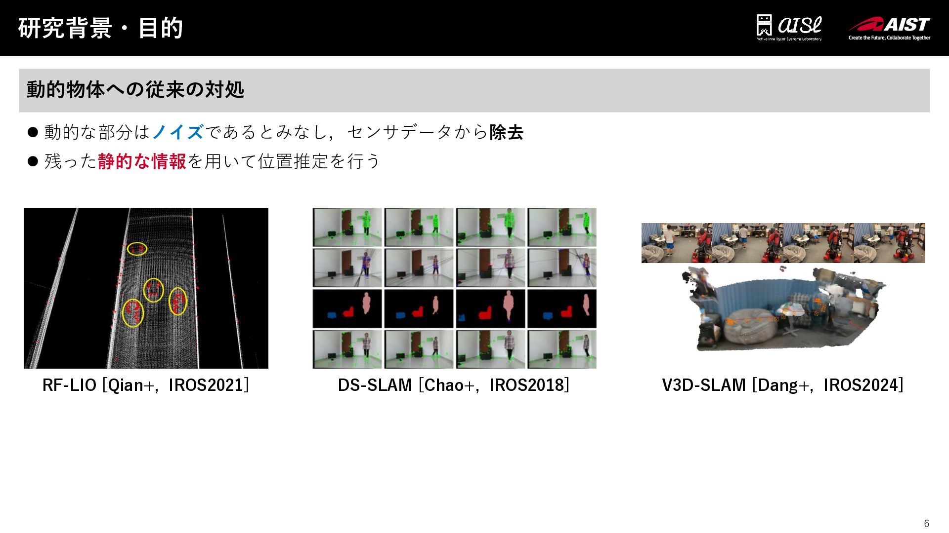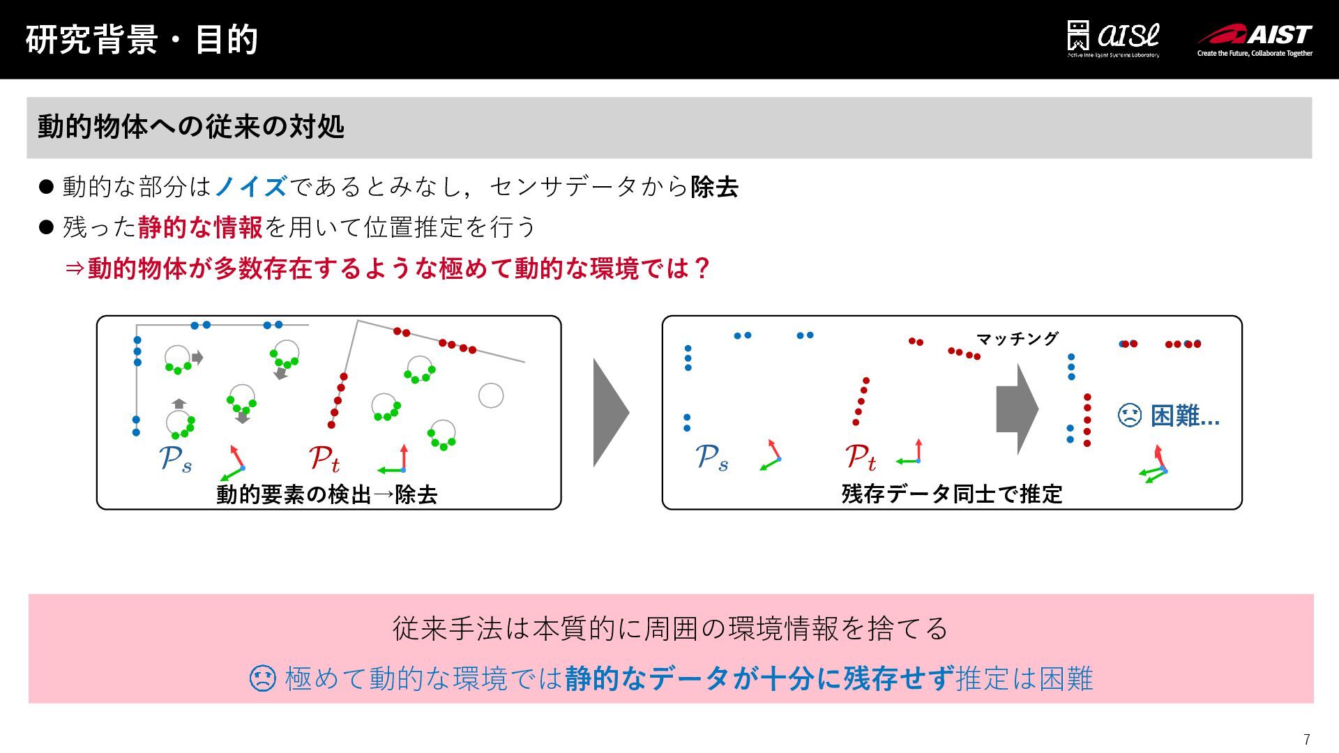 6 研究背景・目的 6 ⚫ 動的な部分はノイズであるとみなし,センサデータから除去 ⚫ 残った静的な情報を用いて位置推定を行う 動的物体への従来の対処 RF-LIO [Qian+,