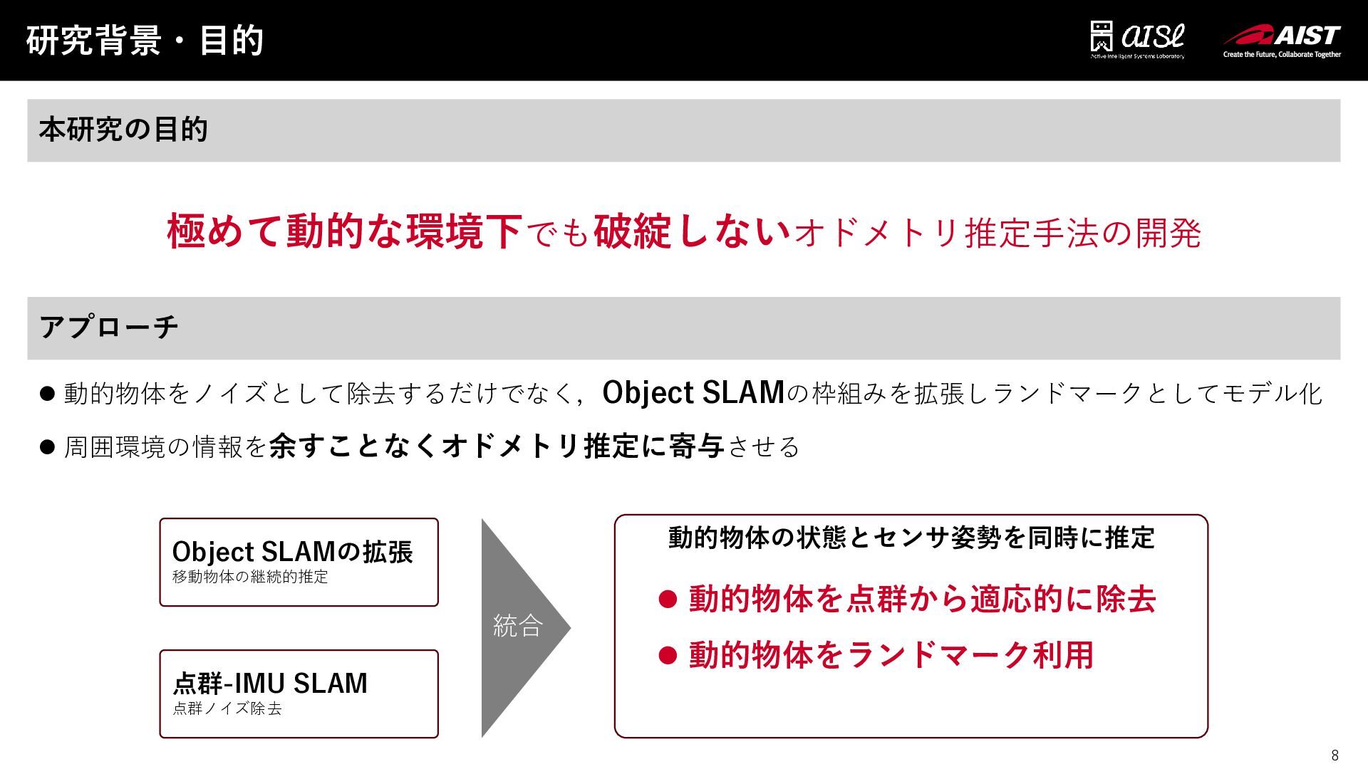 7 研究背景・目的 ⚫ 動的な部分はノイズであるとみなし,センサデータから除去 ⚫ 残った静的な情報を用いて位置推定を行う ⇒動的物体が多数存在するような極めて動的な環境では? 7 動的物体への従来の対処 動的要素の検出→除去