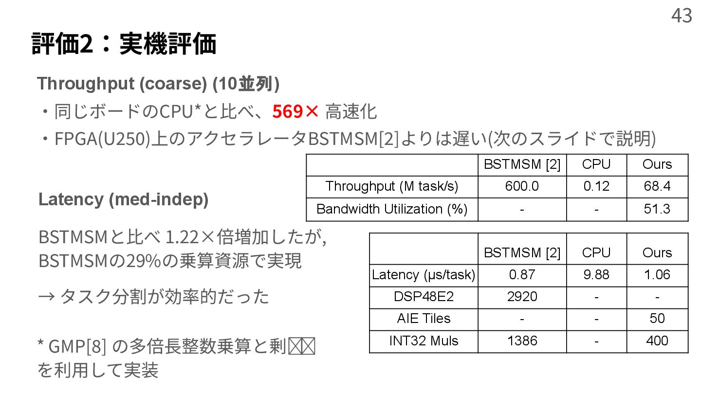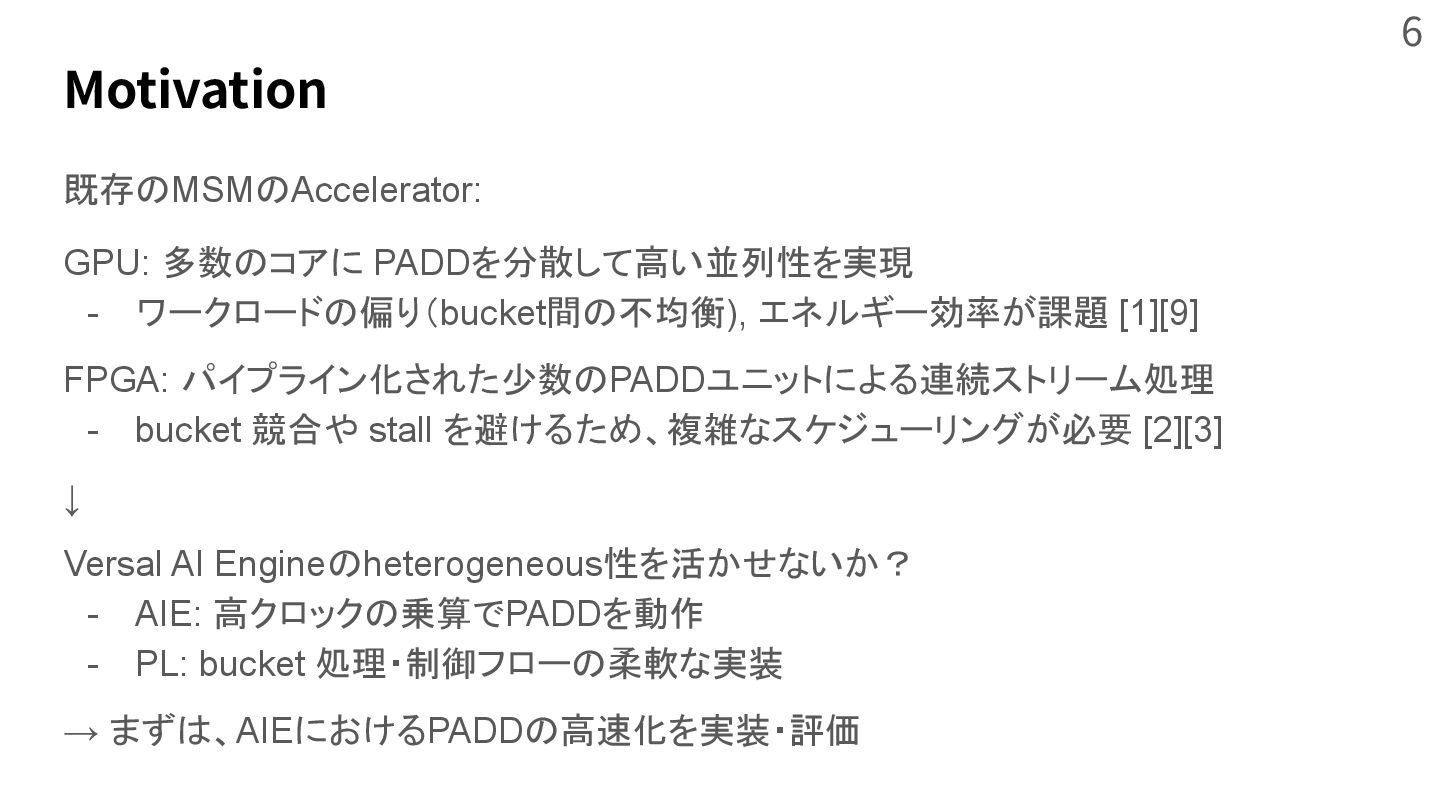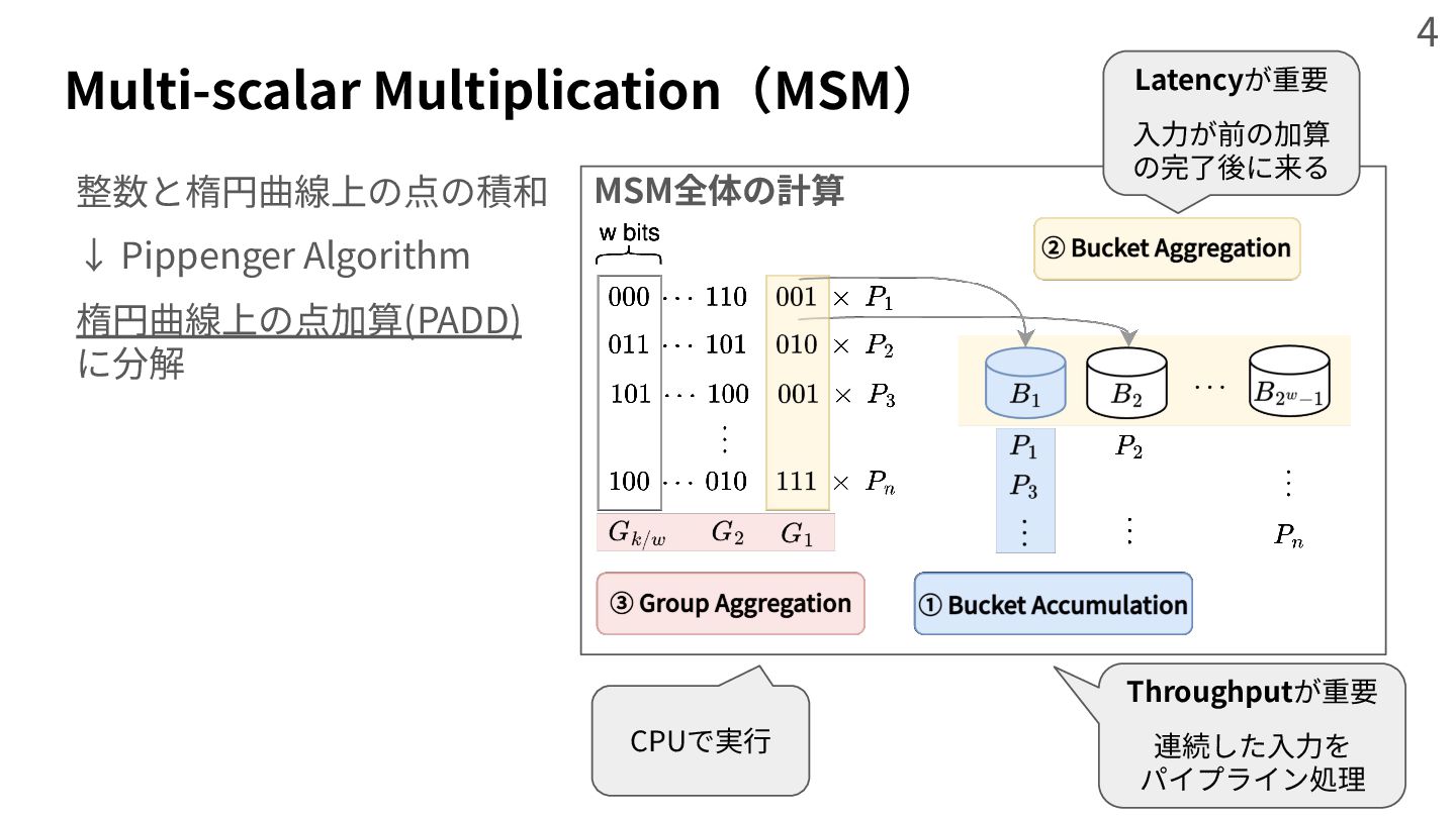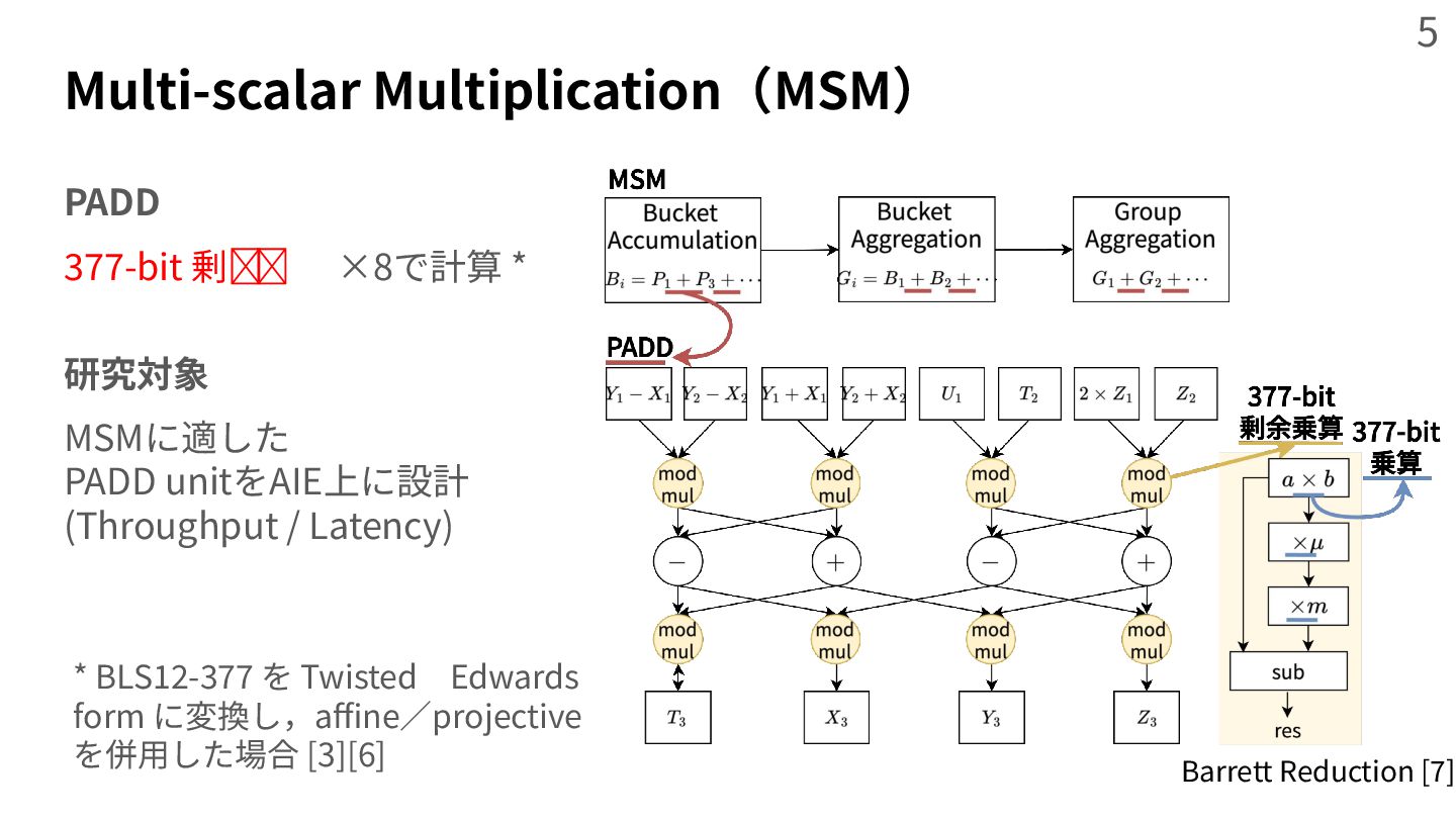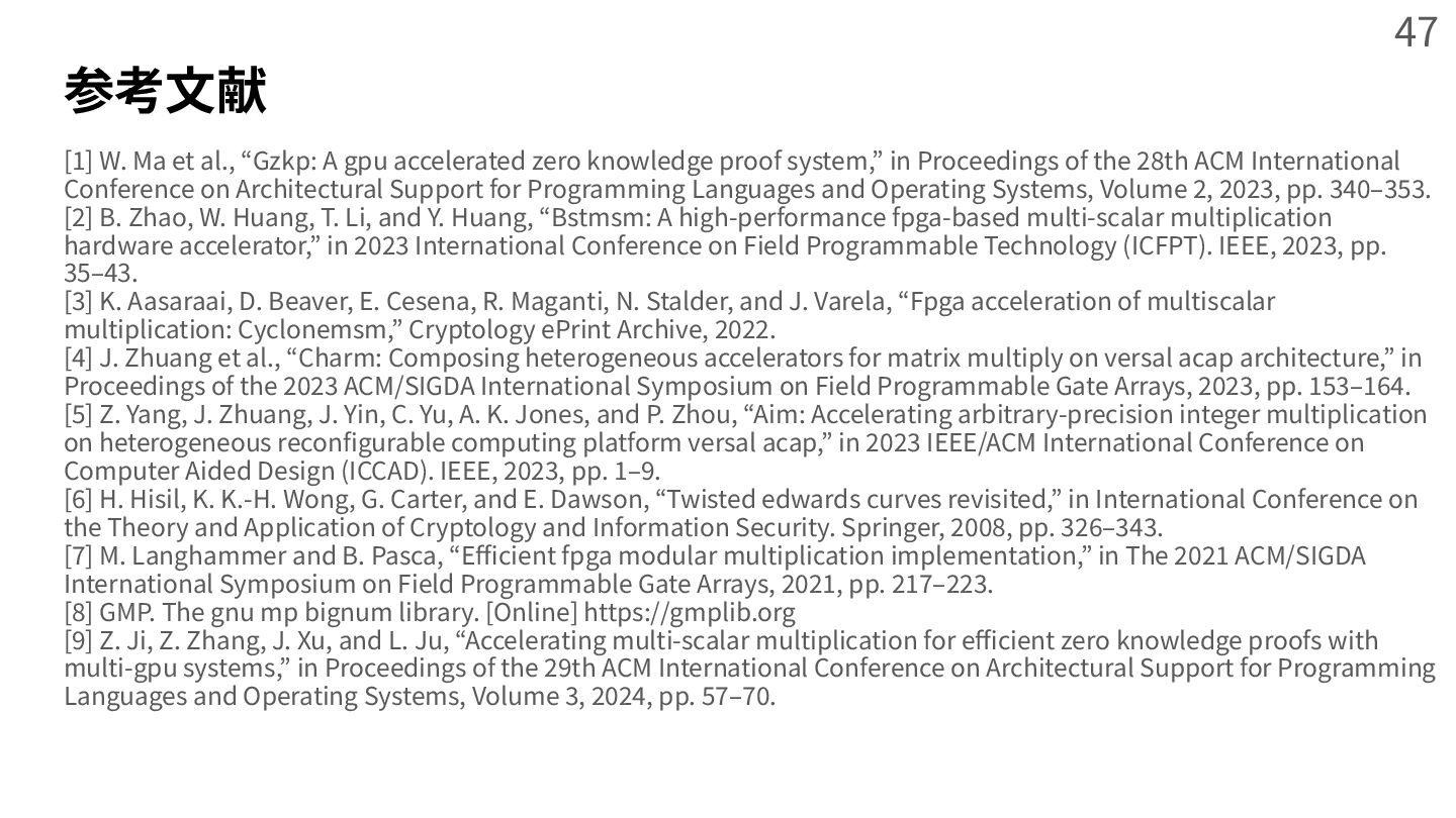 zero knowledge proof system,” in Proceedings of the 28th ACM International Conference on Architectural Support for Programming Languages and Operating Systems, Volume 2, 2023, pp. 340‒353. [2] B. Zhao, W. Huang, T. Li, and Y. Huang, “Bstmsm: A high-performance fpga-based multi-scalar multiplication hardware accelerator,” in 2023 International Conference on Field Programmable Technology (ICFPT). IEEE, 2023, pp. 35‒43. [3] K. Aasaraai, D. Beaver, E. Cesena, R. Maganti, N. Stalder, and J. Varela, “Fpga acceleration of multiscalar multiplication: Cyclonemsm,” Cryptology ePrint Archive, 2022. [4] J. Zhuang et al., “Charm: Composing heterogeneous accelerators for matrix multiply on versal acap architecture,” in Proceedings of the 2023 ACM/SIGDA International Symposium on Field Programmable Gate Arrays, 2023, pp. 153‒164. [5] Z. Yang, J. Zhuang, J. Yin, C. Yu, A. K. Jones, and P. Zhou, “Aim: Accelerating arbitrary-precision integer multiplication on heterogeneous reconfigurable computing platform versal acap,” in 2023 IEEE/ACM International Conference on Computer Aided Design (ICCAD). IEEE, 2023, pp. 1‒9. [6] H. Hisil, K. K.-H. Wong, G. Carter, and E. Dawson, “Twisted edwards curves revisited,” in International Conference on the Theory and Application of Cryptology and Information Security. Springer, 2008, pp. 326‒343. [7] M. Langhammer and B. Pasca, “Efficient fpga modular multiplication implementation,” in The 2021 ACM/SIGDA International Symposium on Field Programmable Gate Arrays, 2021, pp. 217‒223. [8] GMP. The gnu mp bignum library. [Online] https://gmplib.org [9] Z. Ji, Z. Zhang, J. Xu, and L. Ju, “Accelerating multi-scalar multiplication for efficient zero knowledge proofs with multi-gpu systems,” in Proceedings of the 29th ACM International Conference on Architectural Support for Programming Languages and Operating Systems, Volume 3, 2024, pp. 57‒70. 47