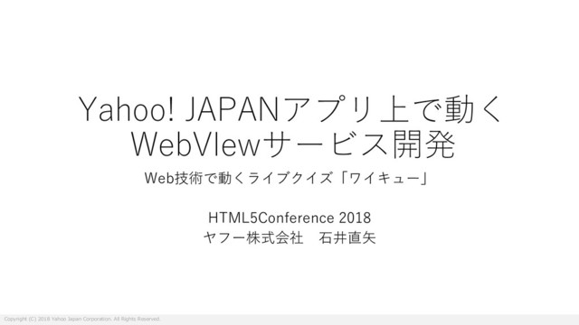 Yahoo! JAPANアプリ上で動く WebVIewサービス開発 Web技術で動くライブクイズ「ワイキュー」 HTML5Conference 2018 ヤフー株式会社 ⽯井直⽮ Copyright (C)