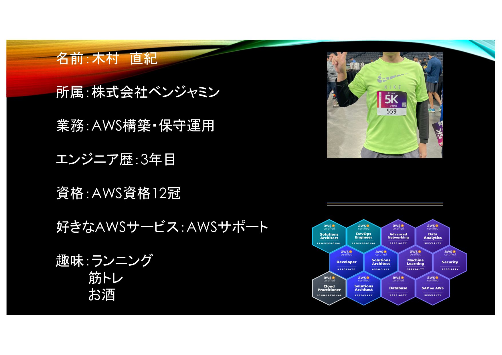 名前:木村 直紀 趣味:ランニング 筋トレ お酒 業務:AWS構築・保守運用 資格:AWS資格12冠 エンジニア歴:3年目 所属:株式会社ベンジャミン 好きなAWSサービス:AWSサポート