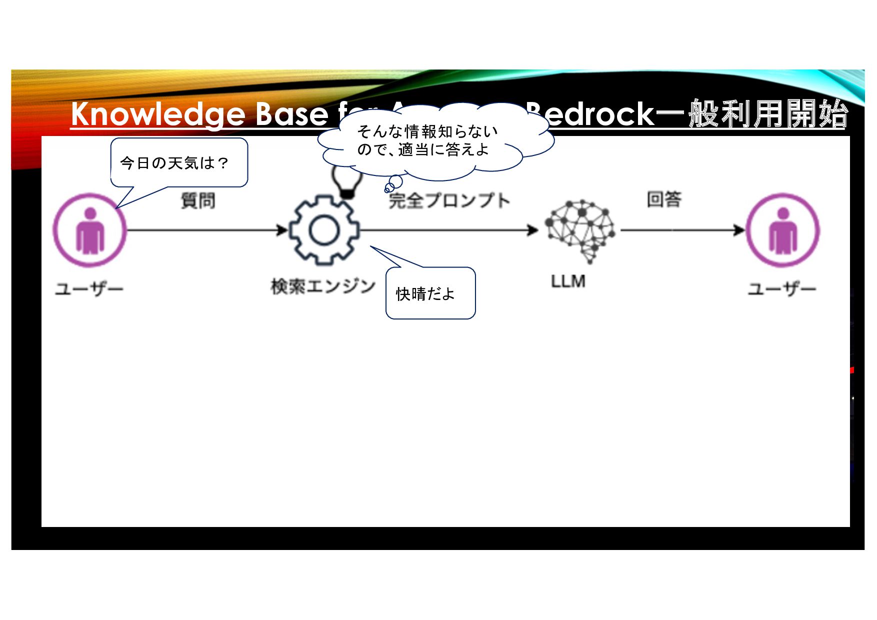 • 基盤モデルとデータソースを組み合わせた拡張 検索生成(RAG)をフルマネージドに実現可能に • Amazon S3内に格納されたデータの場所を指定 するだけで、ベクトルDBにデータを取り込む ワークフローを実行 • バージニアとオレゴンで一般利用開始 天気の情報 そんな情報知らない ので、適当に答えよ 今日の天気は?