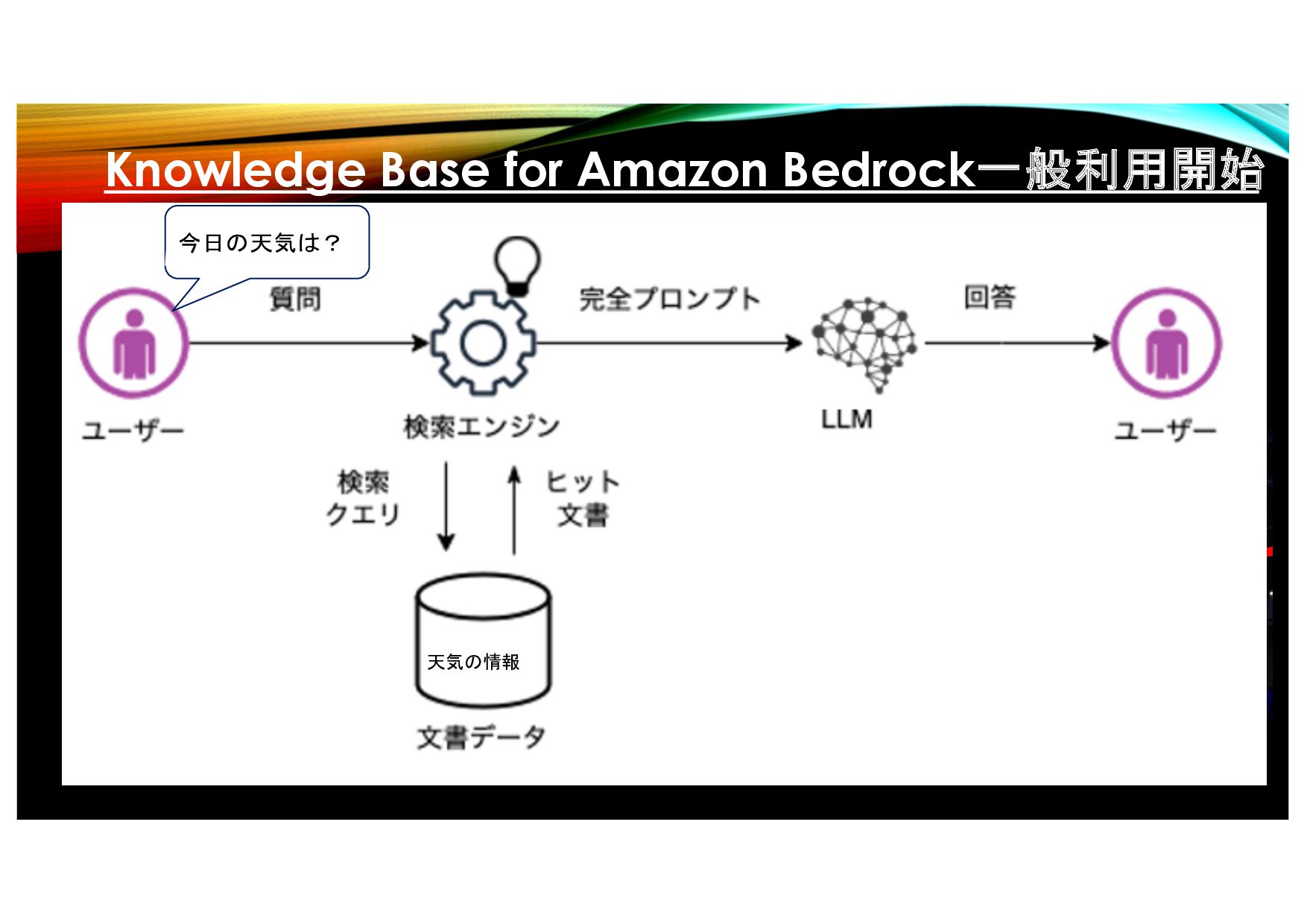 • 基盤モデルとデータソースを組み合わせた拡張 検索生成(RAG)をフルマネージドに実現可能に • Amazon S3内に格納されたデータの場所を指定 するだけで、ベクトルDBにデータを取り込む ワークフローを実行 • バージニアとオレゴンで一般利用開始 天気の情報 今日の天気は?