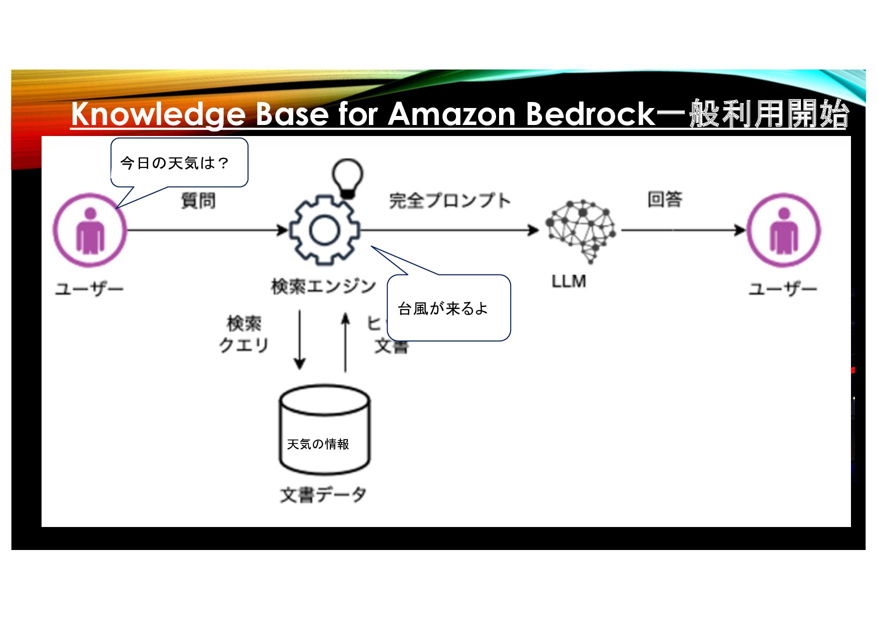 • 基盤モデルとデータソースを組み合わせた拡張 検索生成(RAG)をフルマネージドに実現可能に • Amazon S3内に格納されたデータの場所を指定 するだけで、ベクトルDBにデータを取り込む ワークフローを実行 • バージニアとオレゴンで一般利用開始 天気の情報 今日の天気は? 台風が来るよ