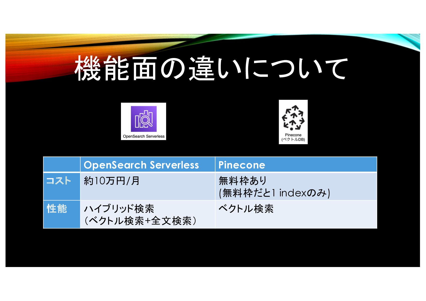 機能面の違いについて OpenSearch Serverless Pinecone コスト 約10万円/月 無料枠あり (無料枠だと1 indexのみ) 性能