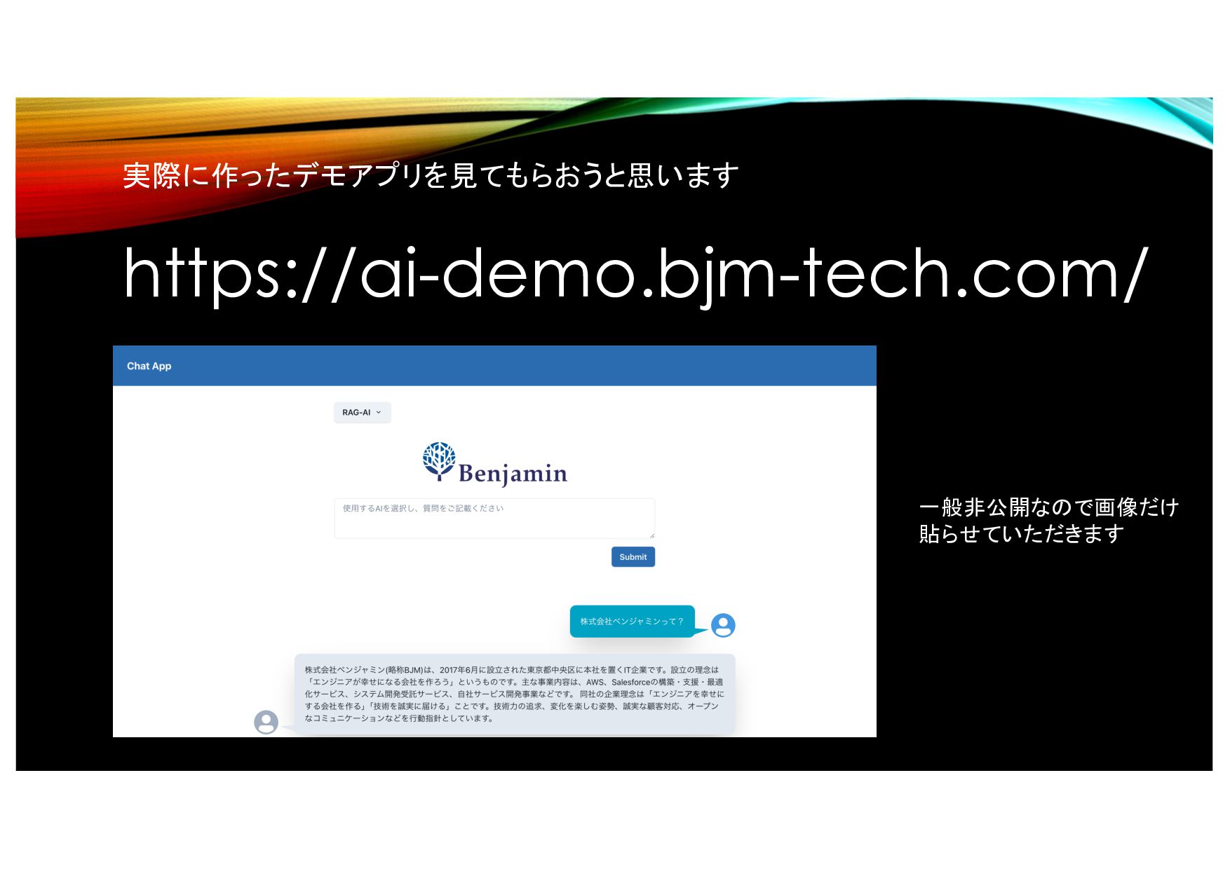 https://ai-demo.bjm-tech.com/ 実際に作ったデモアプリを見てもらおうと思います 一般非公開なので画像だけ 貼らせていただきます