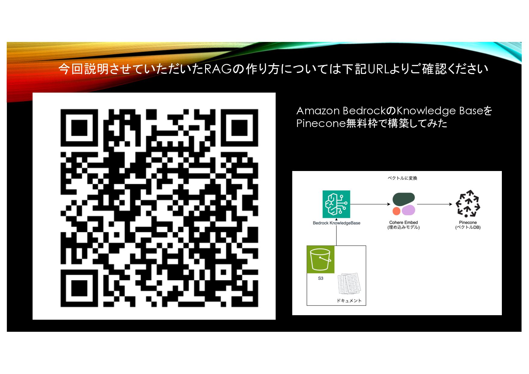 Amazon BedrockのKnowledge Baseを Pinecone無料枠で構築してみた 今回説明させていただいたRAGの作り方については下記URLよりご確認ください