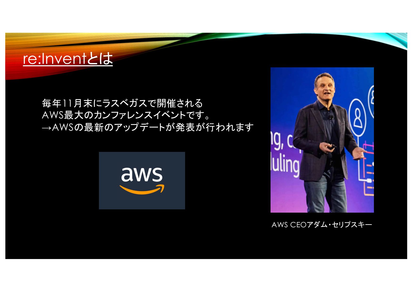 re:Inventとは 毎年11月末にラスベガスで開催される AWS最大のカンファレンスイベントです。 →AWSの最新のアップデートが発表が行われます AWS CEOアダム・セリプスキー