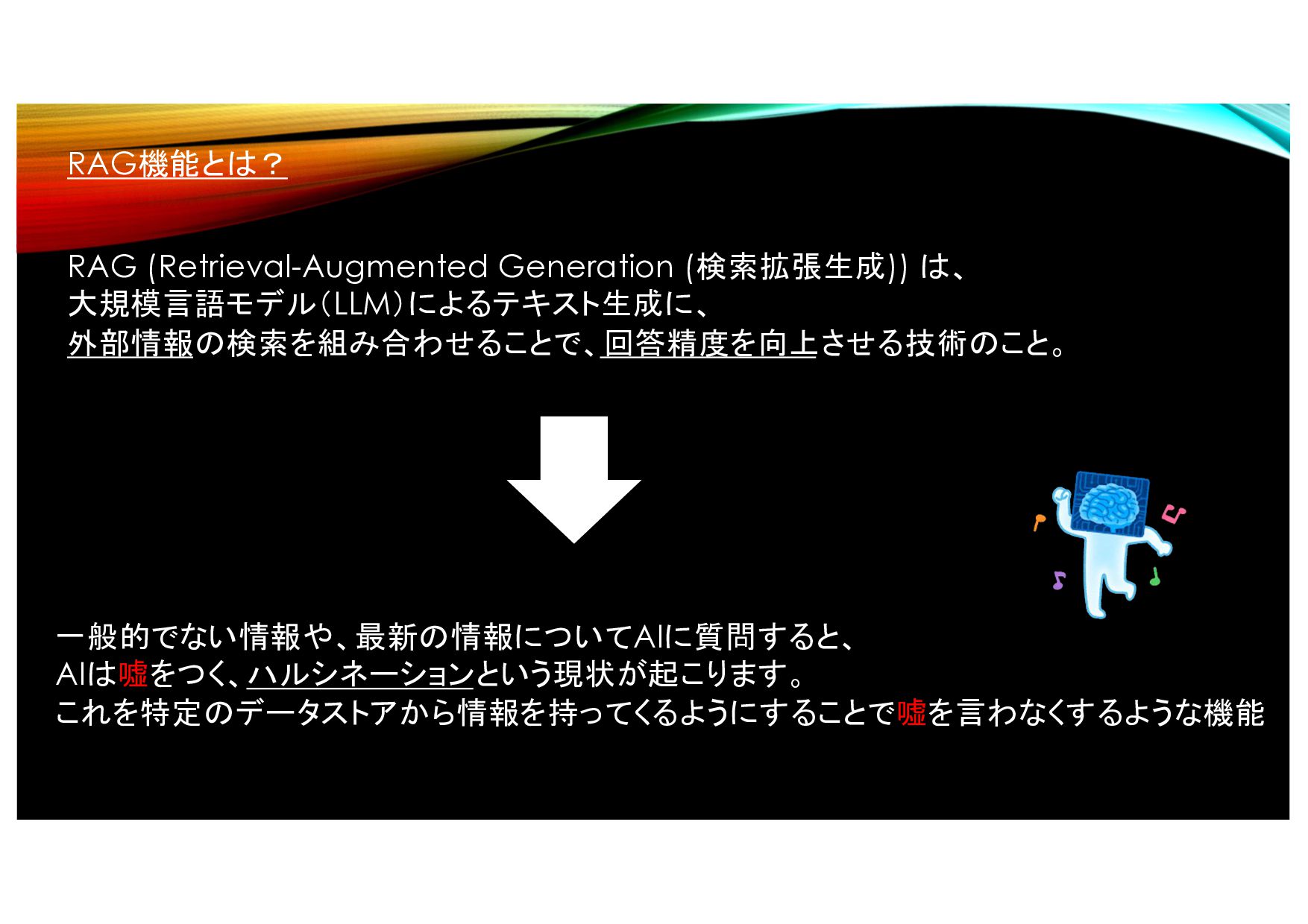RAG機能とは? RAG (Retrieval-Augmented Generation (検索拡張生成)) は、 大規模言語モデル(LLM)によるテキスト生成に、 外部情報の検索を組み合わせることで、回答精度を向上させる技術のこと。 一般的でない情報や、最新の情報についてAIに質問すると、 AIは嘘をつく、ハルシネーションという現状が起こります。