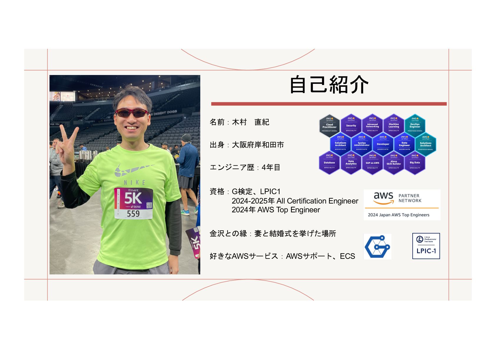 1. 名前:木村 直紀 金沢との縁:妻と結婚式を挙げた場所 資格:G検定、LPIC1 2024-2025年 All Certification Engineer 2024年 AWS