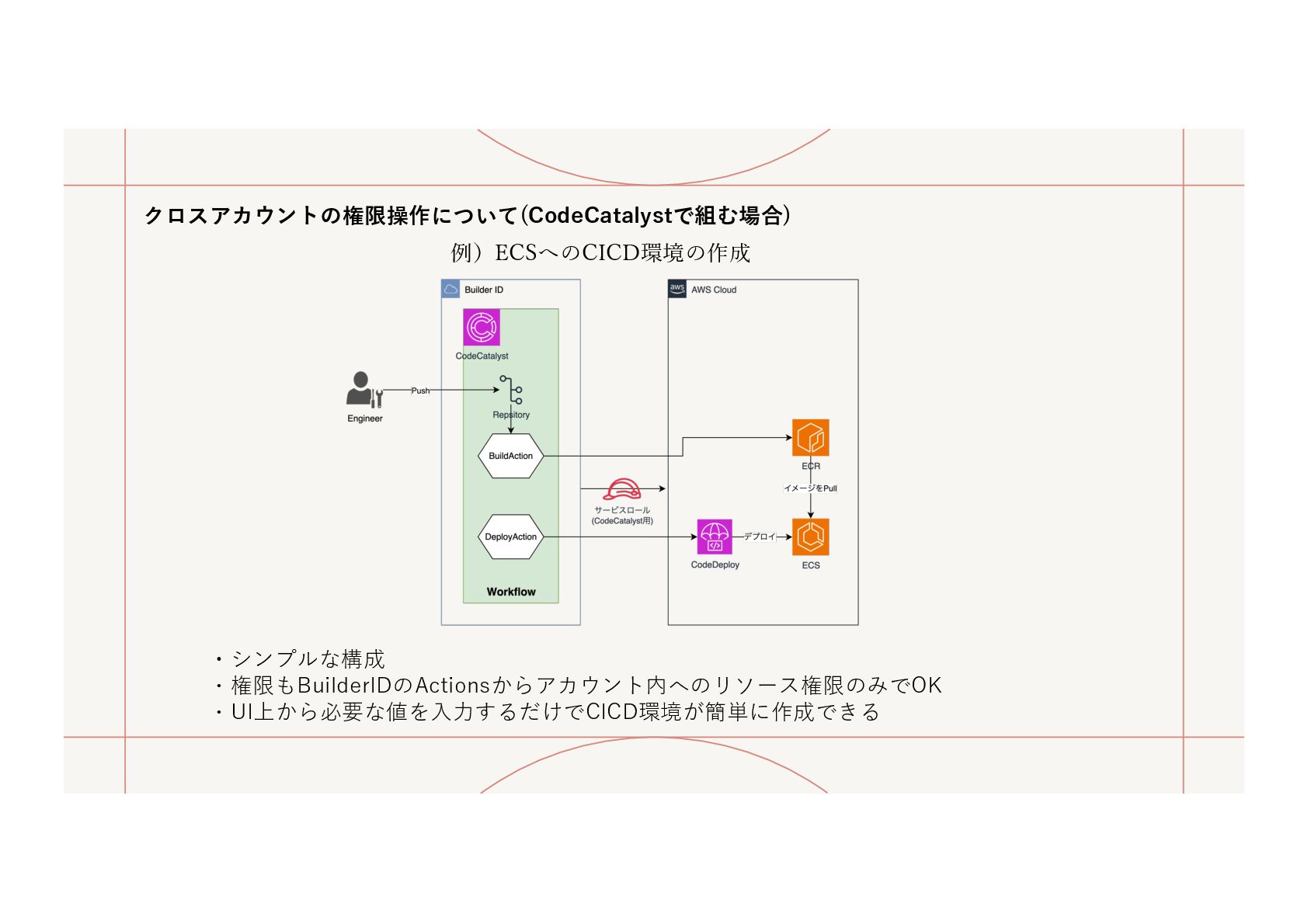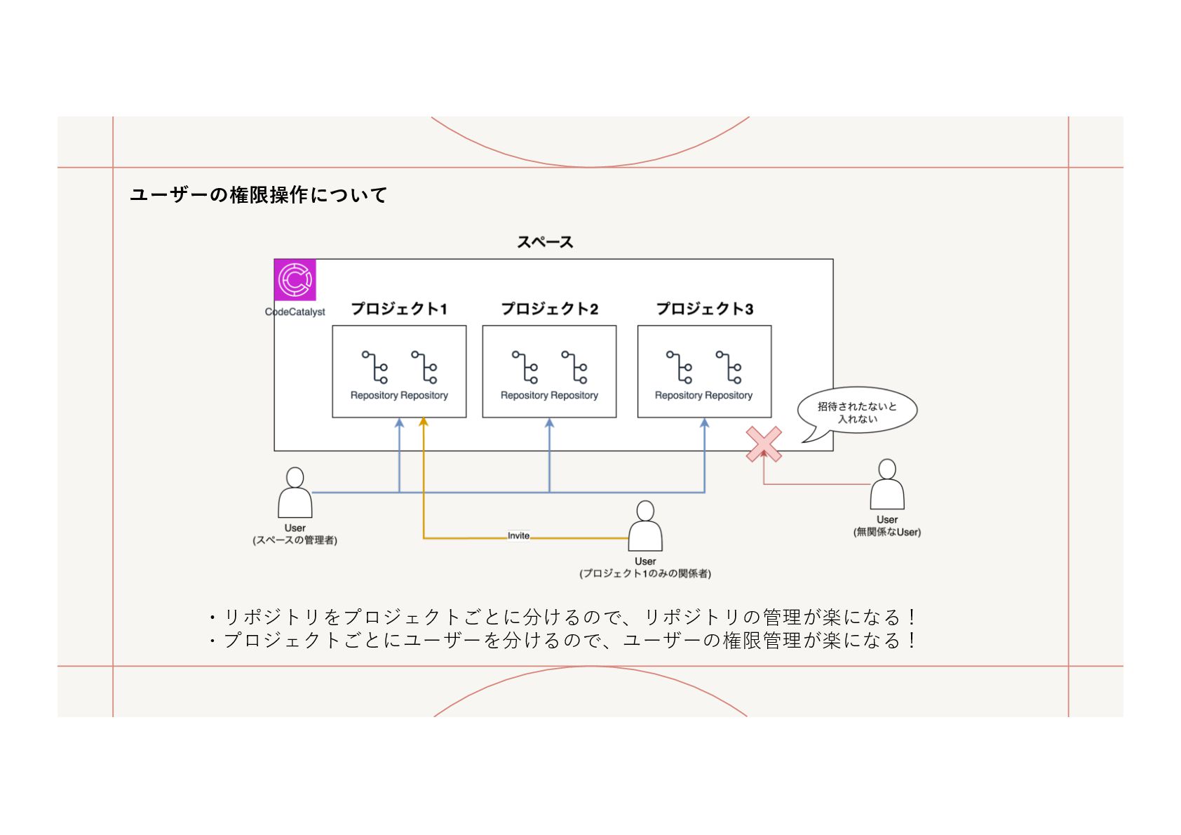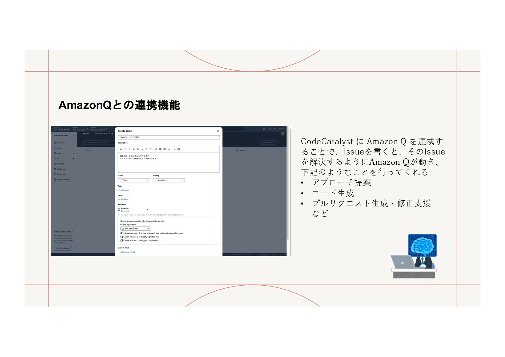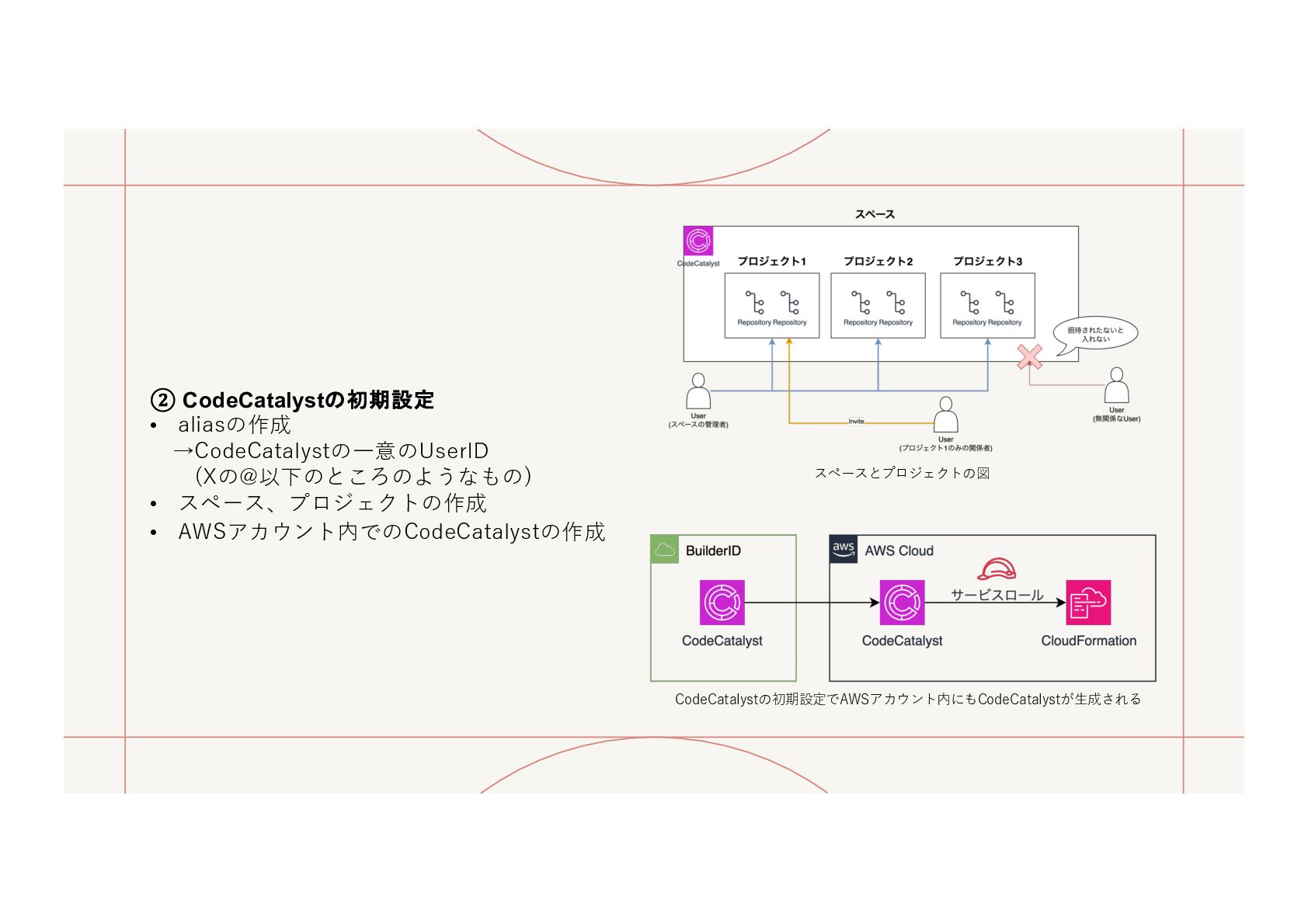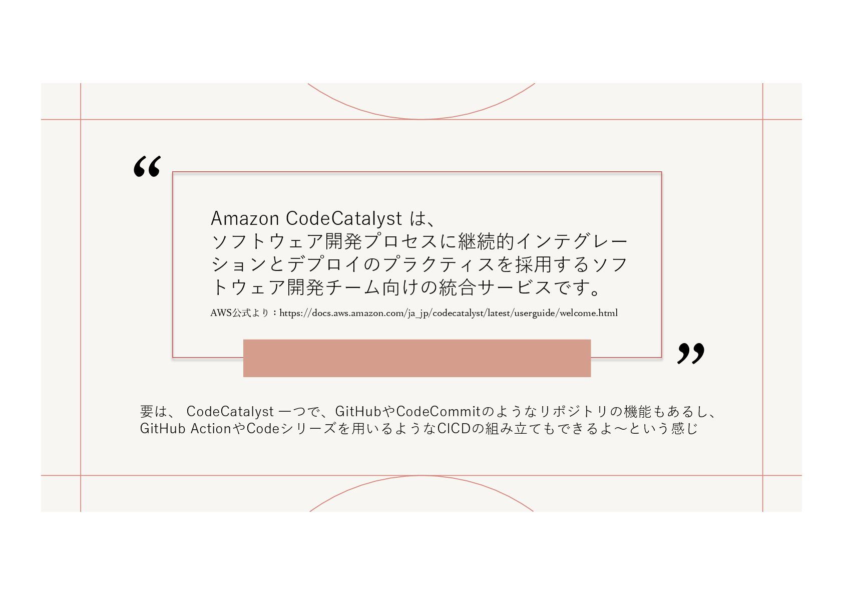 ⼀つで、GitHubやCodeCommitのようなリポジトリの機能もあるし、 GitHub ActionやCodeシリーズを⽤いるようなCICDの組み⽴てもできるよ〜という感じ AWS公式より:https://docs.aws.amazon.com/ja_jp/codecatalyst/latest/userguide/welcome.html