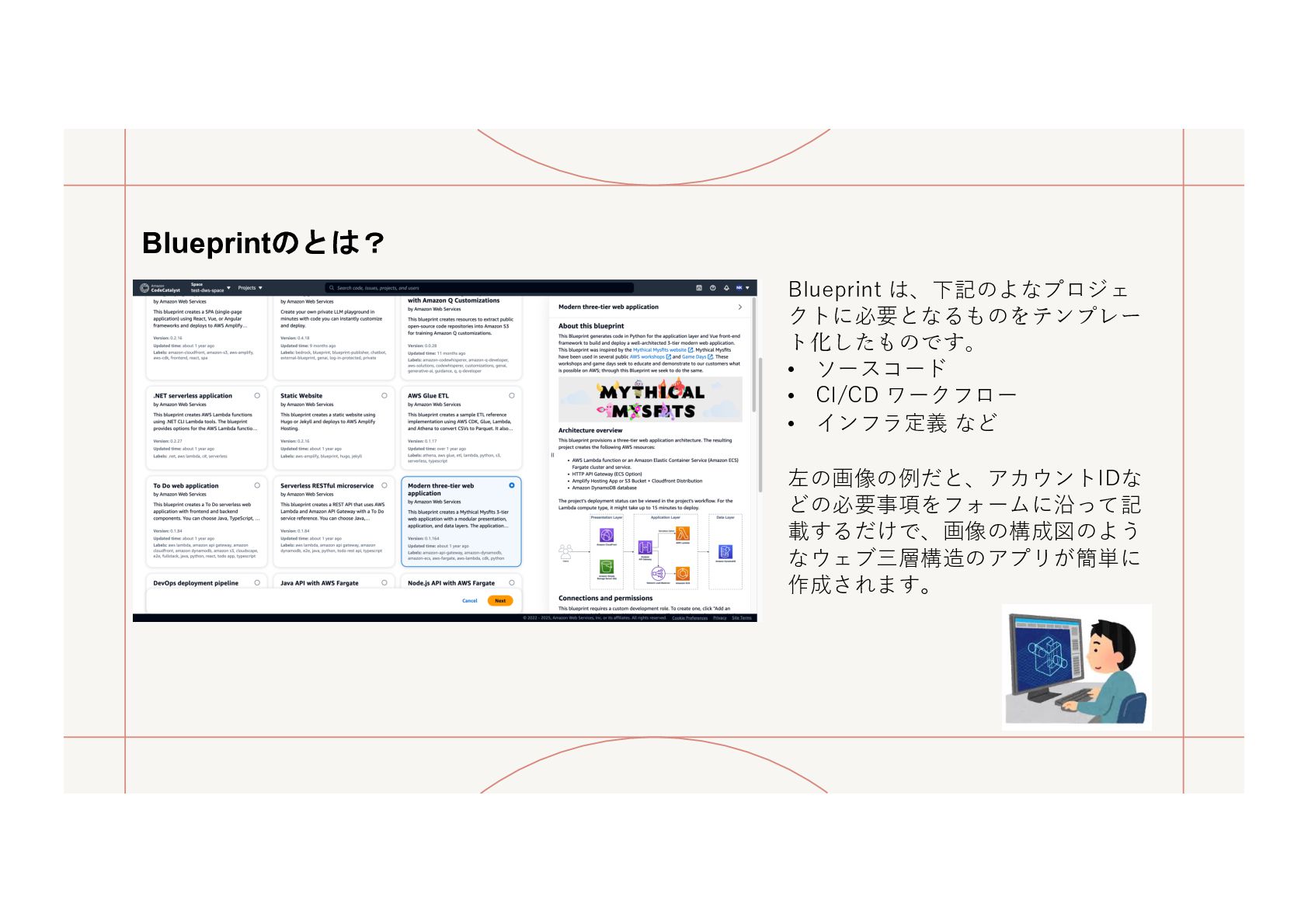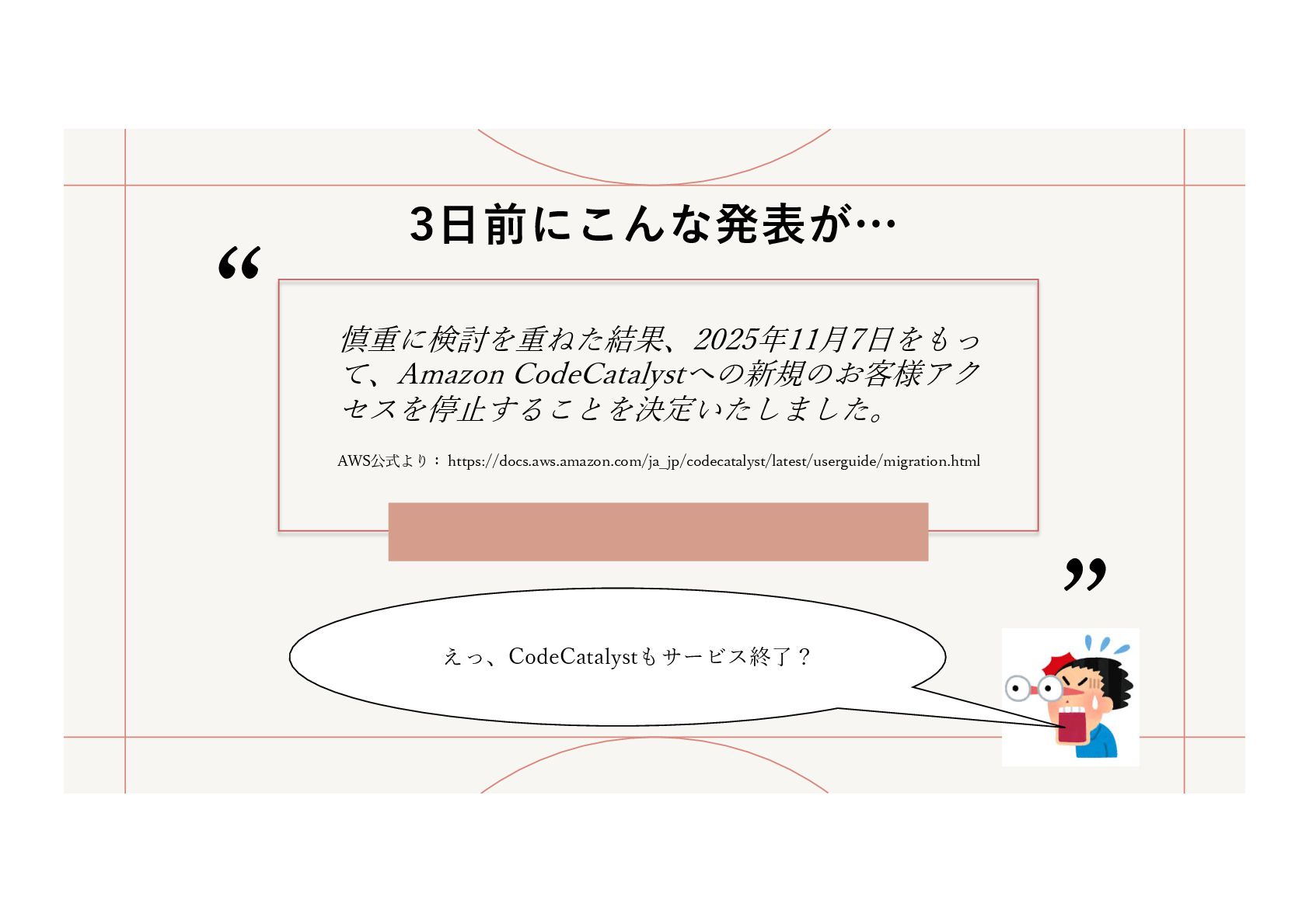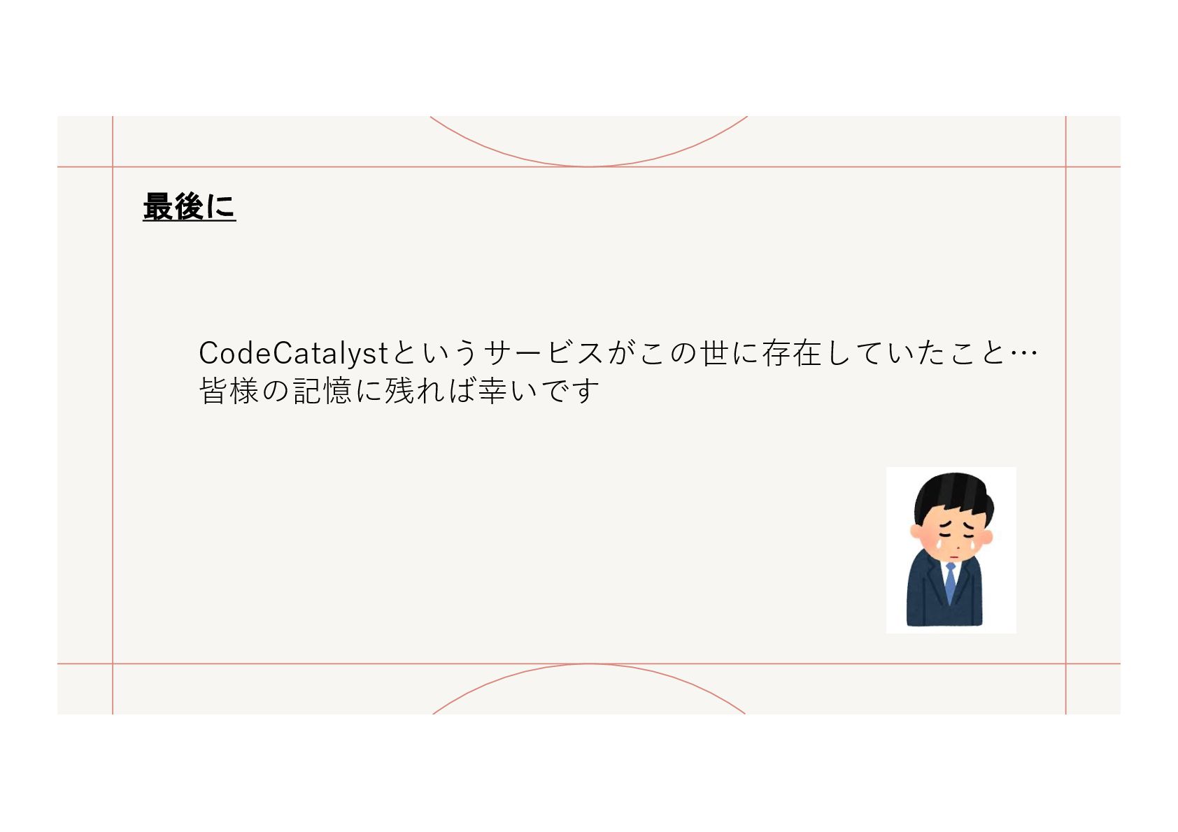 CodeCatalystでCDKのワークフローが簡単に作れるということを説明する内容ですが、登壇予定の3日前にCodeCatalystのサービス終了が発表されたため、それについても触れた内容になっています。