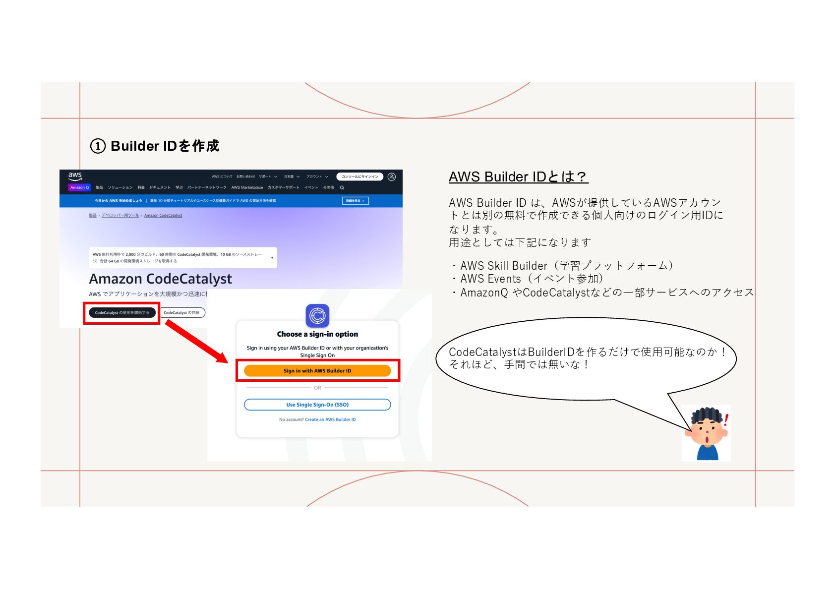 AWS Builder IDとは? ・AWS Skill Builder(学習プラットフォーム) ・AWS Events(イベント参加) ・AmazonQ やCodeCatalystなどの⼀部サービスへのアクセス CodeCatalystはBuilderIDを作るだけで使⽤可能なのか! それほど、⼿間では無いな!