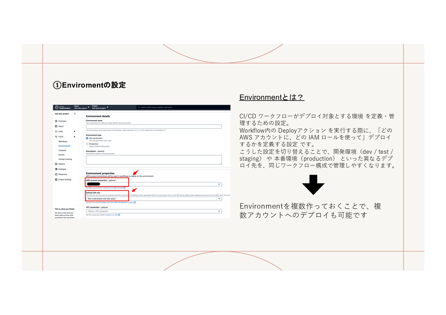 IAM ロールを使って」デプロイ するかを定義する設定 です。 こうした設定を切り替えることで、開発環境(dev / test / staging) や 本番環境(production) といった異なるデプ ロイ先を、同じワークフロー構成で管理しやすくなります。 Environmentとは? Environmentを複数作っておくことで、複 数アカウントへのデプロイも可能です