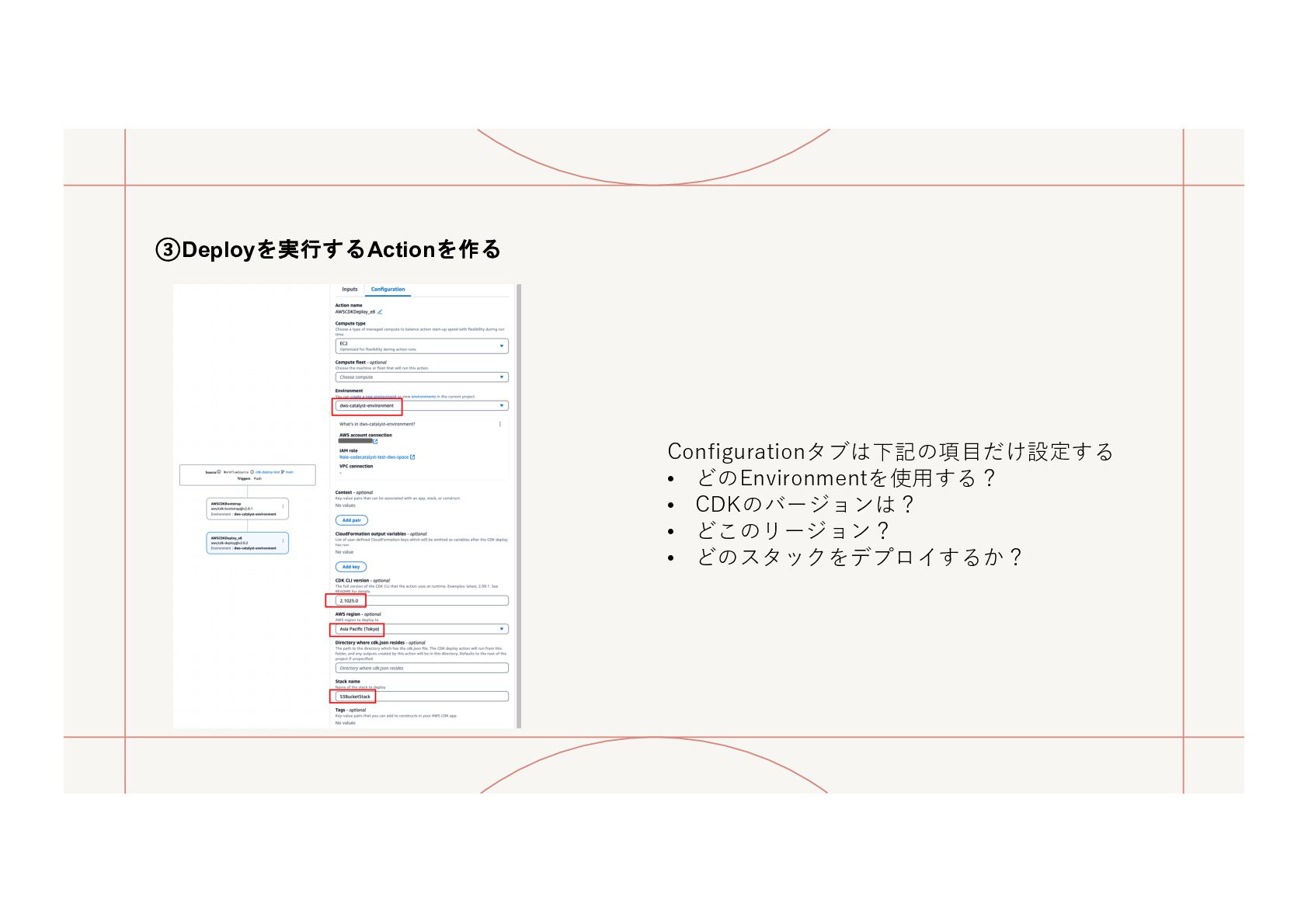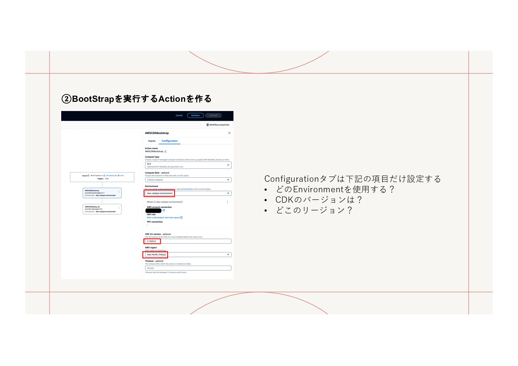 6. ①Enviromentの設定 CI/CD ワークフローがデプロイ対象とする環境 を定義・管 理するための設定。 Workflow内の Deployアクション を実⾏する際に、「どの AWS アカウントに、どの