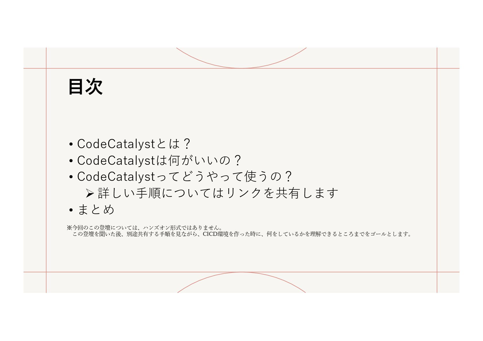 まとめ ※今回のこの登壇については、ハンズオン形式ではありません。 この登壇を聞いた後、別途共有する⼿順を⾒ながら、CICD環境を作った時に、何をしているかを理解できるところまでをゴールとします。