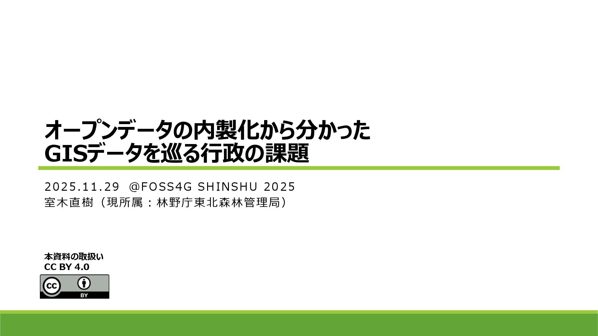 オープンデータの内製化から分かった GISデータを巡る行政の課題 2025.11.29 @FOSS4G SHINSHU 2025 室木直樹(現所属:林野庁東北森林管理局) 本資料の取扱い CC BY