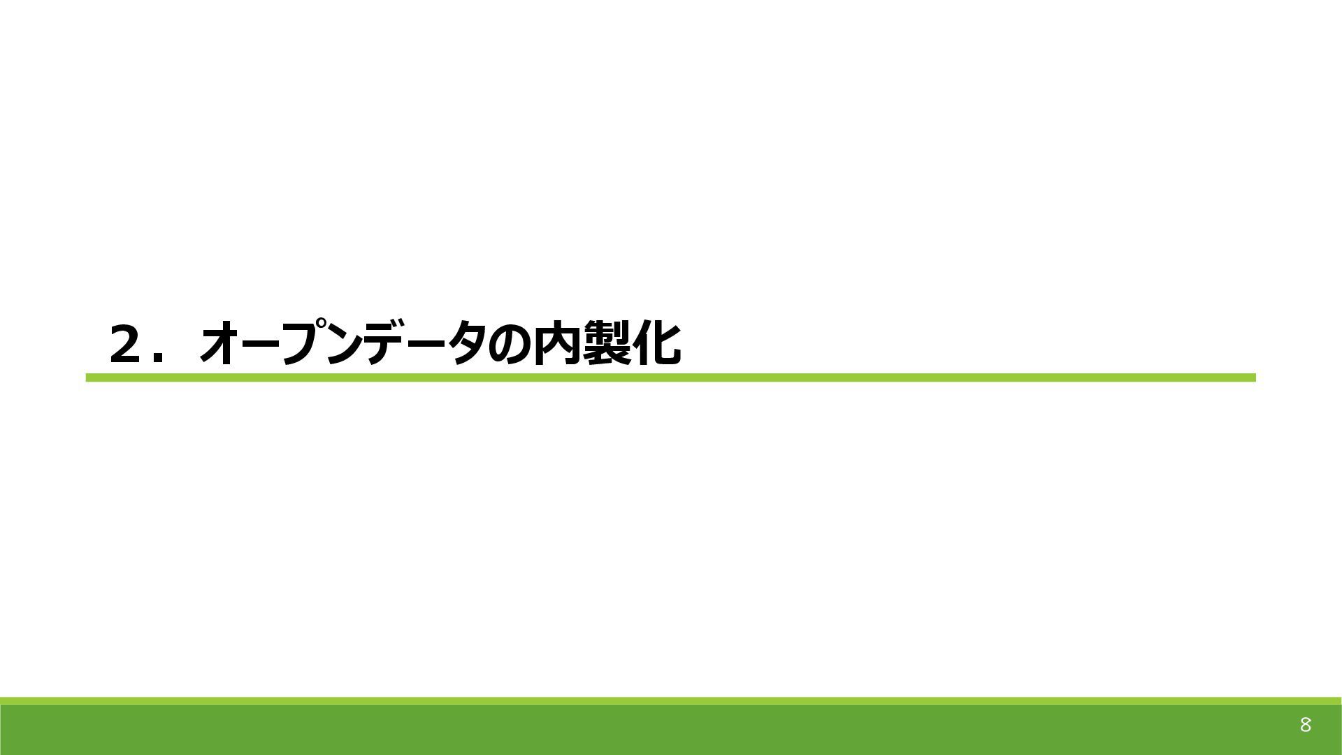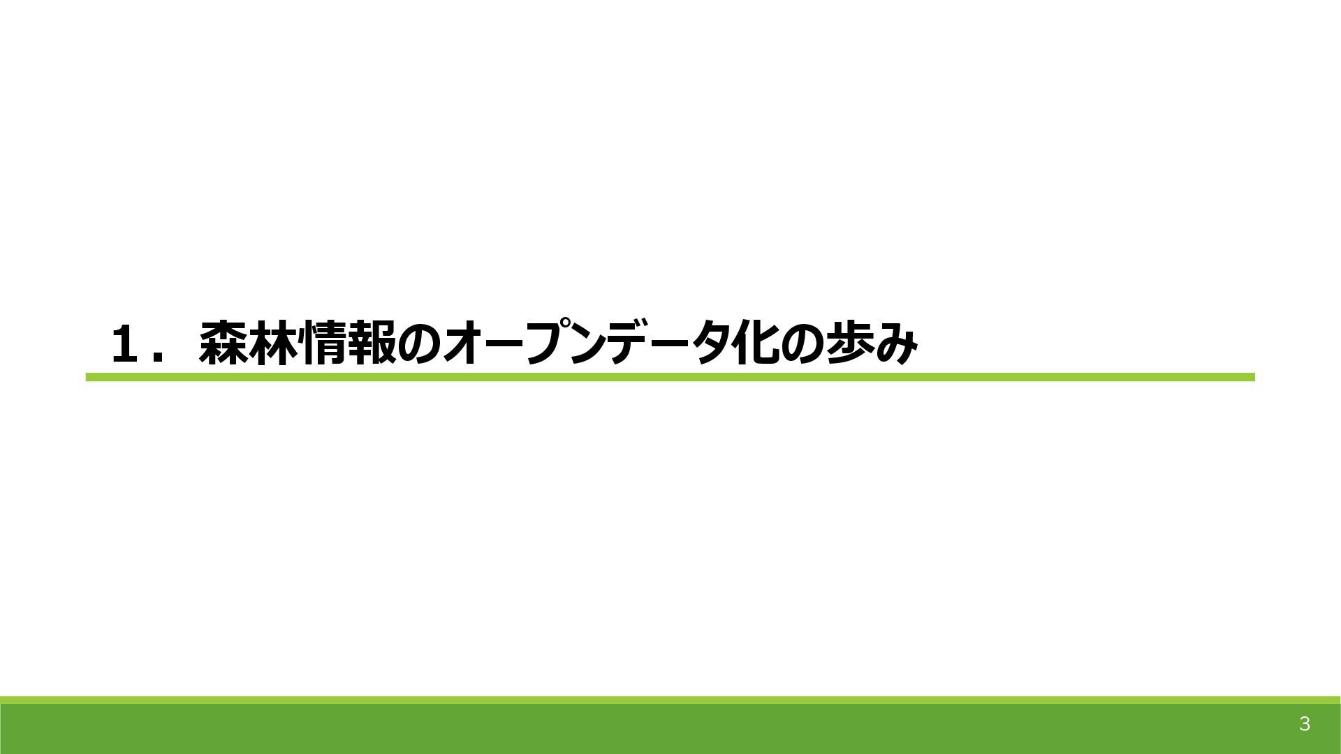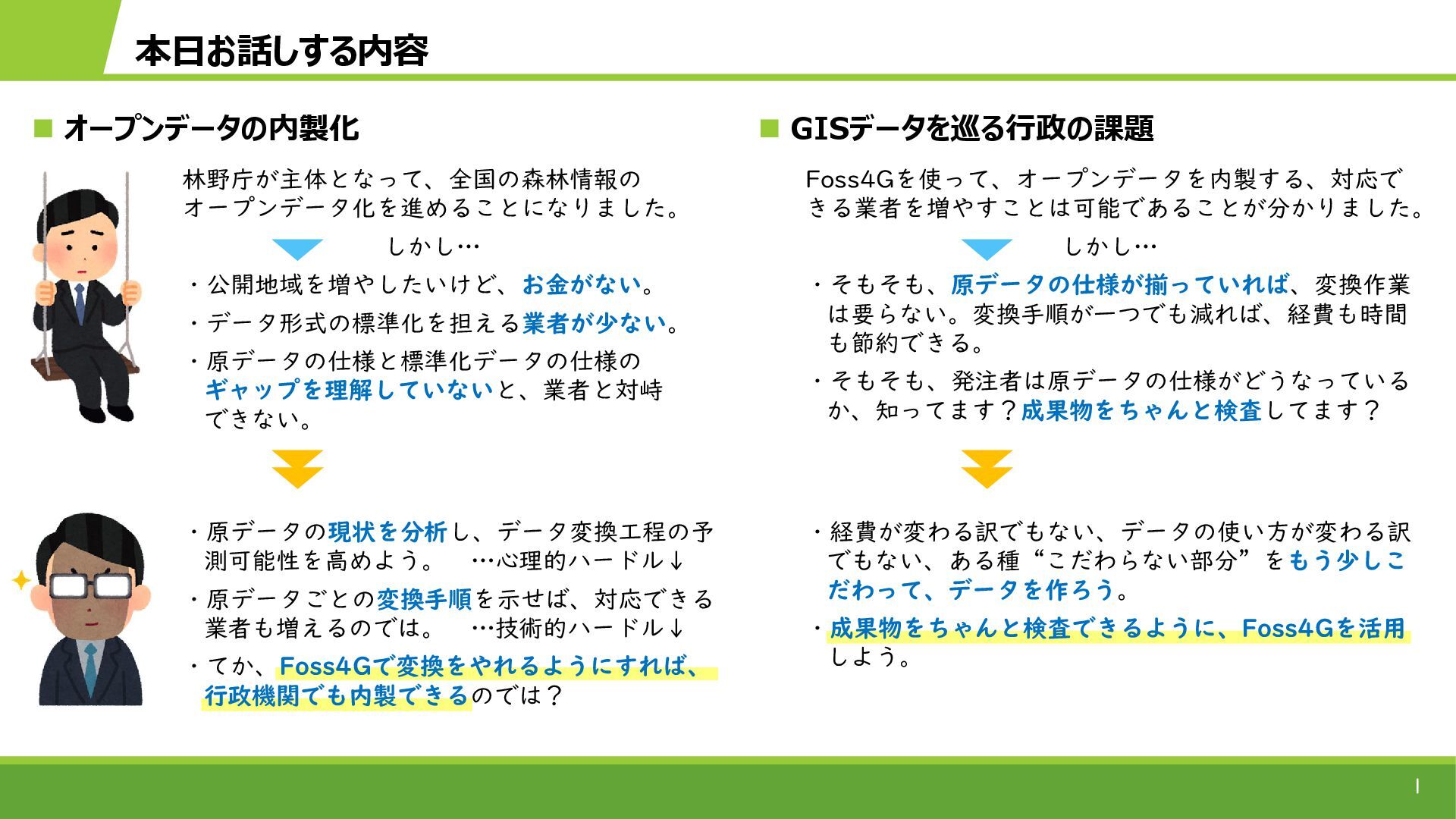 本日お話しする内容 GISデータを巡る行政の課題 オープンデータの内製化 1 林野庁が主体となって、全国の森林情報の オープンデータ化を進めることになりました。 しかし… ・公開地域を増やしたいけど、お金がない。 ・データ形式の標準化を担える業者が少ない。 ・原データの仕様と標準化データの仕様の