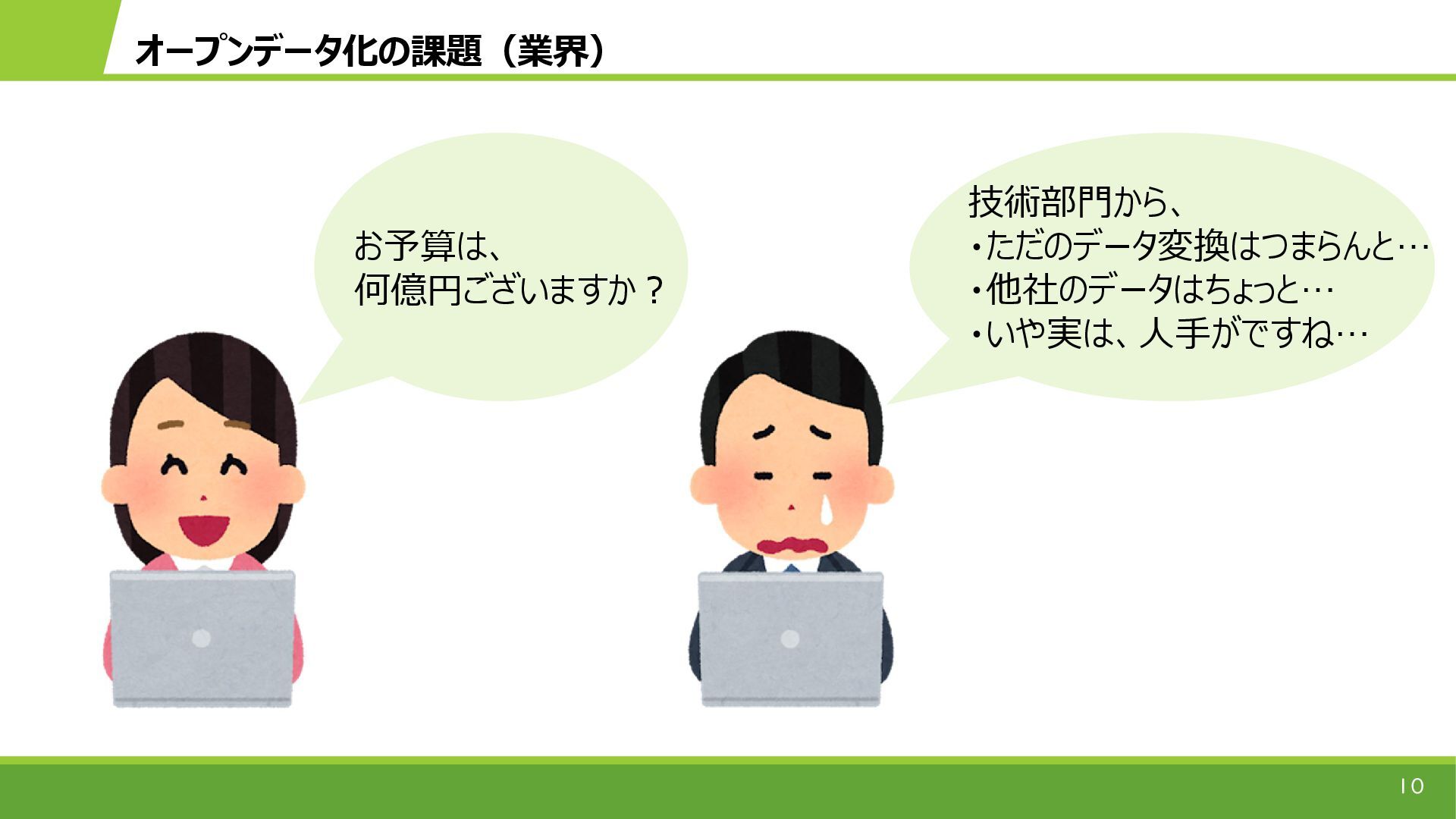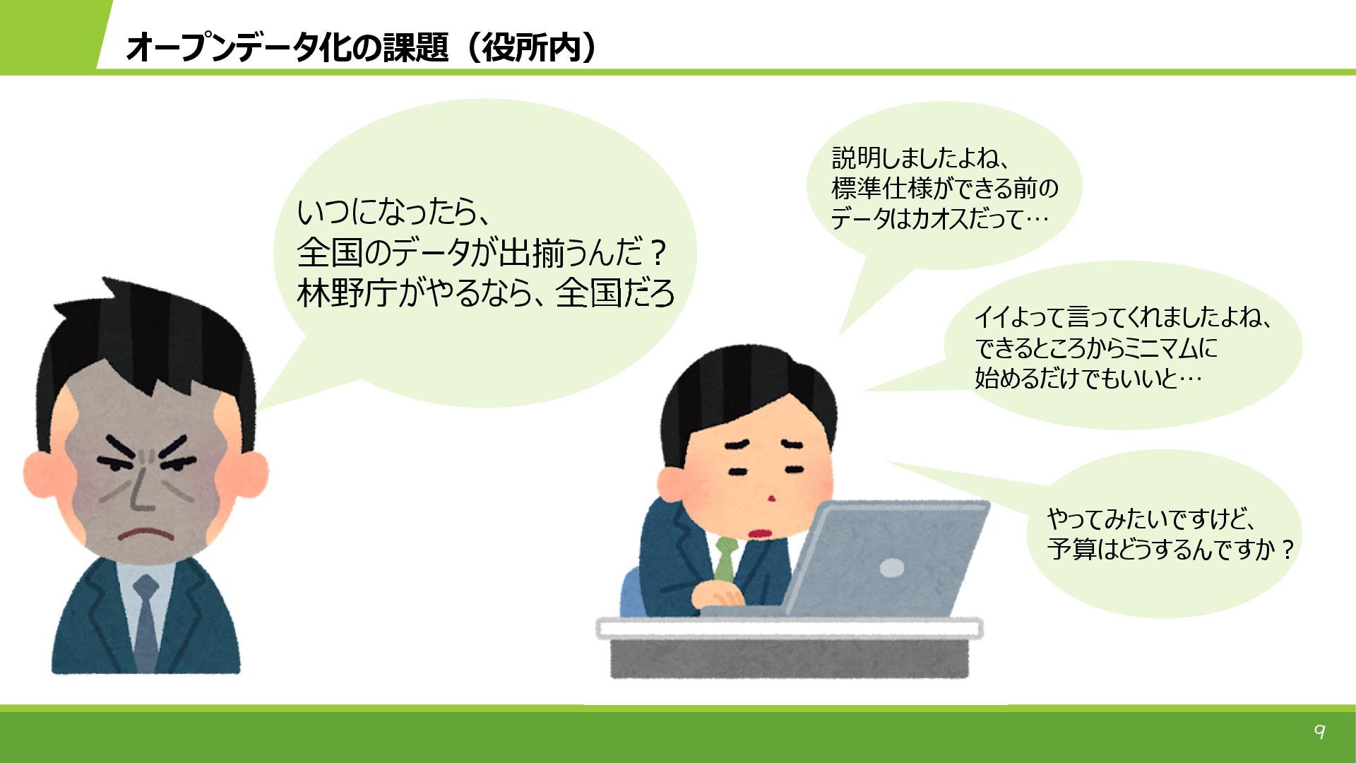 オープンデータ化の課題(役所内) 9 いつになったら、 全国のデータが出揃うんだ? 林野庁がやるなら、全国だろ 説明しましたよね、 標準仕様ができる前の データはカオスだって… イイよって言ってくれましたよね、 できるところからミニマムに