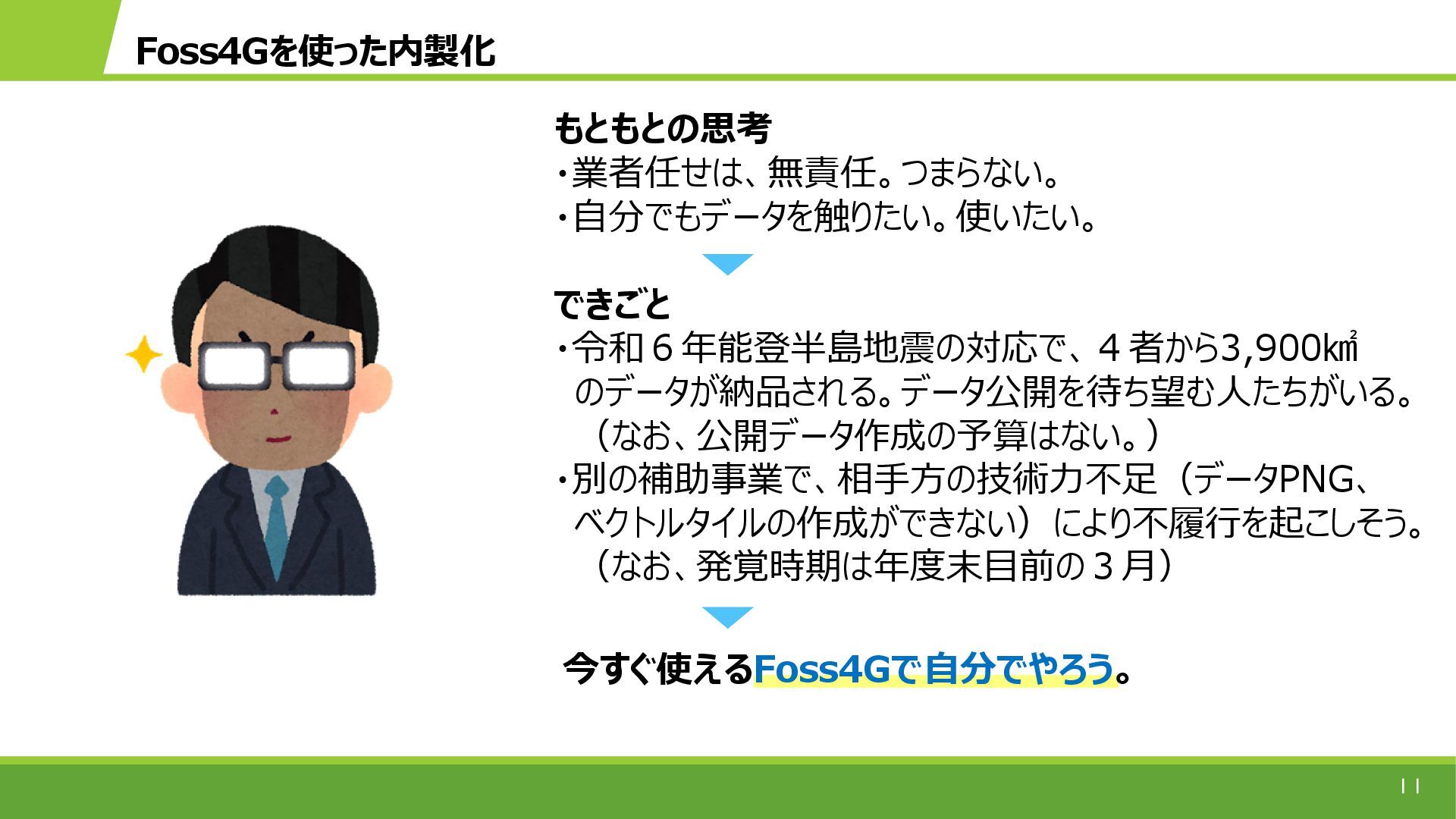 ギャップを理解していないと、業者と対峙 できない。 ・原データの現状を分析し、データ変換工程の予 測可能性を高めよう。 …心理的ハードル↓ ・原データごとの変換手順を示せば、対応できる 業者も増えるのでは。 …技術的ハードル↓ ・てか、Foss4Gで変換をやれるようにすれば、 行政機関でも内製できるのでは? Foss4Gを使って、オープンデータを内製する、対応で きる業者を増やすことは可能であることが分かりました。 しかし… ・そもそも、原データの仕様が揃っていれば、変換作業 は要らない。変換手順が一つでも減れば、経費も時間 も節約できる。 ・そもそも、発注者は原データの仕様がどうなっている か、知ってます?成果物をちゃんと検査してます? ・経費が変わる訳でもない、データの使い方が変わる訳 でもない、ある種“こだわらない部分”をもう少しこ だわって、データを作ろう。 ・成果物をちゃんと検査できるように、Foss4Gを活用 しよう。