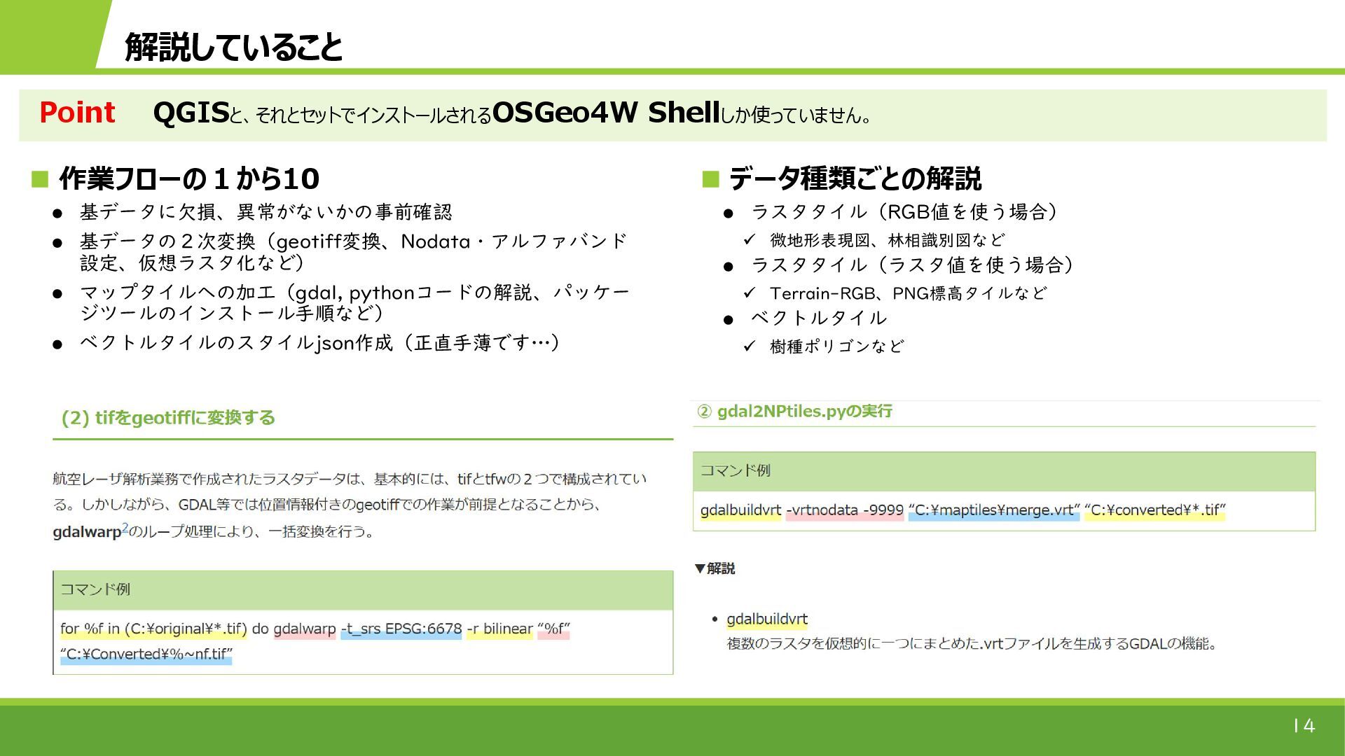 ベクトルタイル 樹種ポリゴンなど 作業フローの1から10 基データに欠損、異常がないかの事前確認 基データの2次変換(geotiff変換、Nodata・アルファバンド 設定、仮想ラスタ化など) マップタイルへの加工(gdal, pythonコードの解説、パッケー ジツールのインストール手順など) ベクトルタイルのスタイルjson作成(正直手薄です…)
