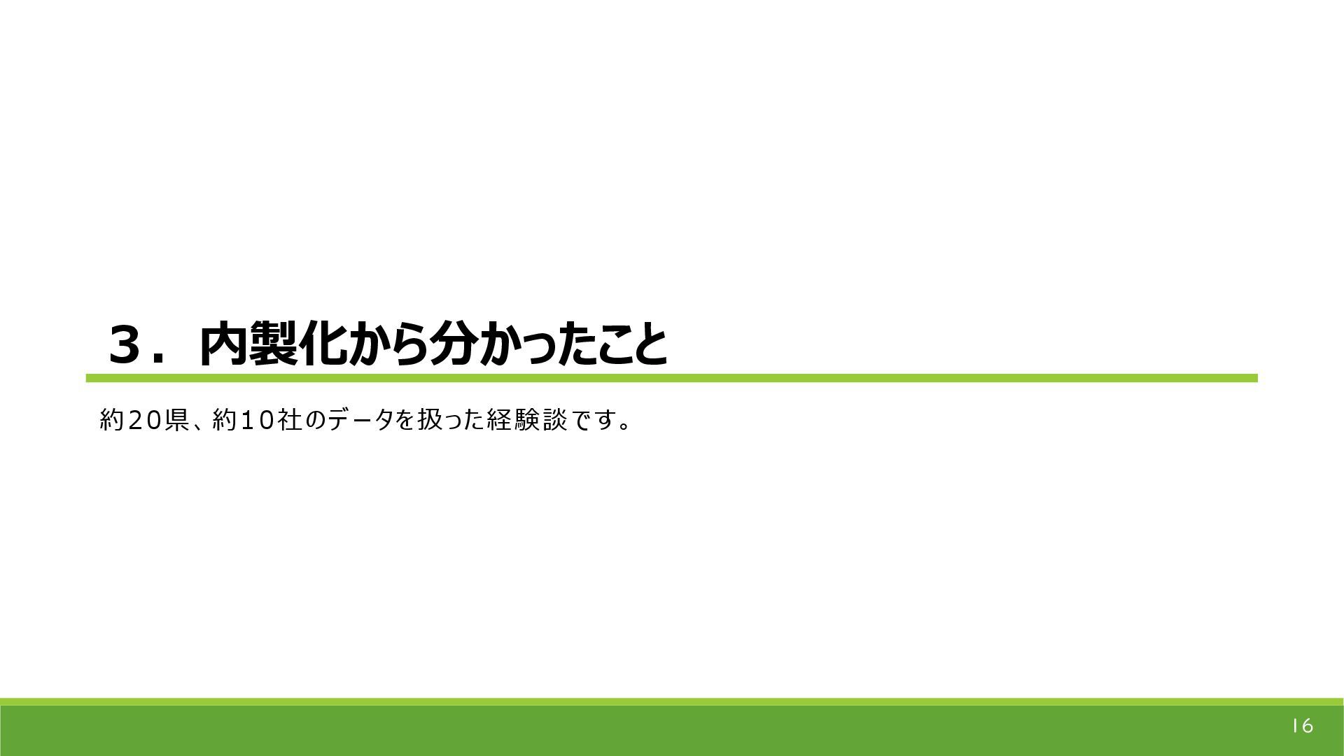 3.内製化から分かったこと 約20県、約10社のデータを扱った経験談です。 16