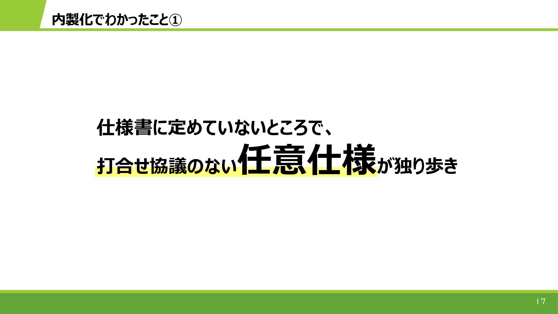 内製化でわかったこと① 17 仕様書に定めていないところで、 打合せ協議のない 任意仕様が独り歩き