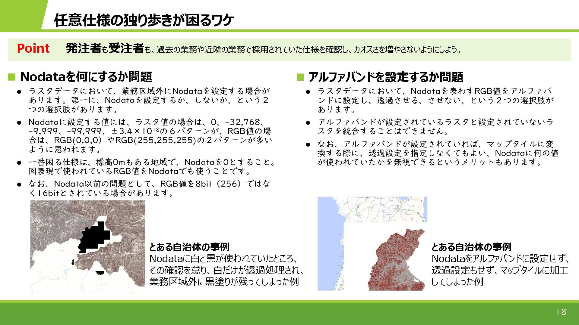 が使われていたかを無視できるというメリットもあります。 Nodataを何にするか問題 ラスタデータにおいて、業務区域外にNodataを設定する場合が あります。第一に、Nodataを設定するか、しないか、という2 つの選択肢があります。 Nodataに設定する値には、ラスタ値の場合は、0、-32,768、 -9,999、-99,999、±3.4×1018の6パターンが、RGB値の場 合は、RGB(0,0,0)やRGB(255,255,255)の2パターンが多い ように思われます。 一番困る仕様は、標高0mもある地域で、Nodataを0とすること。 図表現で使われているRGB値をNodataでも使うことです。 なお、Nodata以前の問題として、RGB値を8bit(256)ではな く16bitとされている場合があります。 Point 発注者も受注者も、過去の業務や近隣の業務で採用されていた仕様を確認し、カオスさを増やさないようにしよう。 とある自治体の事例 Nodataに白と黒が使われていたところ、 その確認を怠り、白だけが透過処理され、 業務区域外に黒塗りが残ってしまった例 とある自治体の事例 Nodataをアルファバンドに設定せず、 透過設定もせず、マップタイルに加工 してしまった例