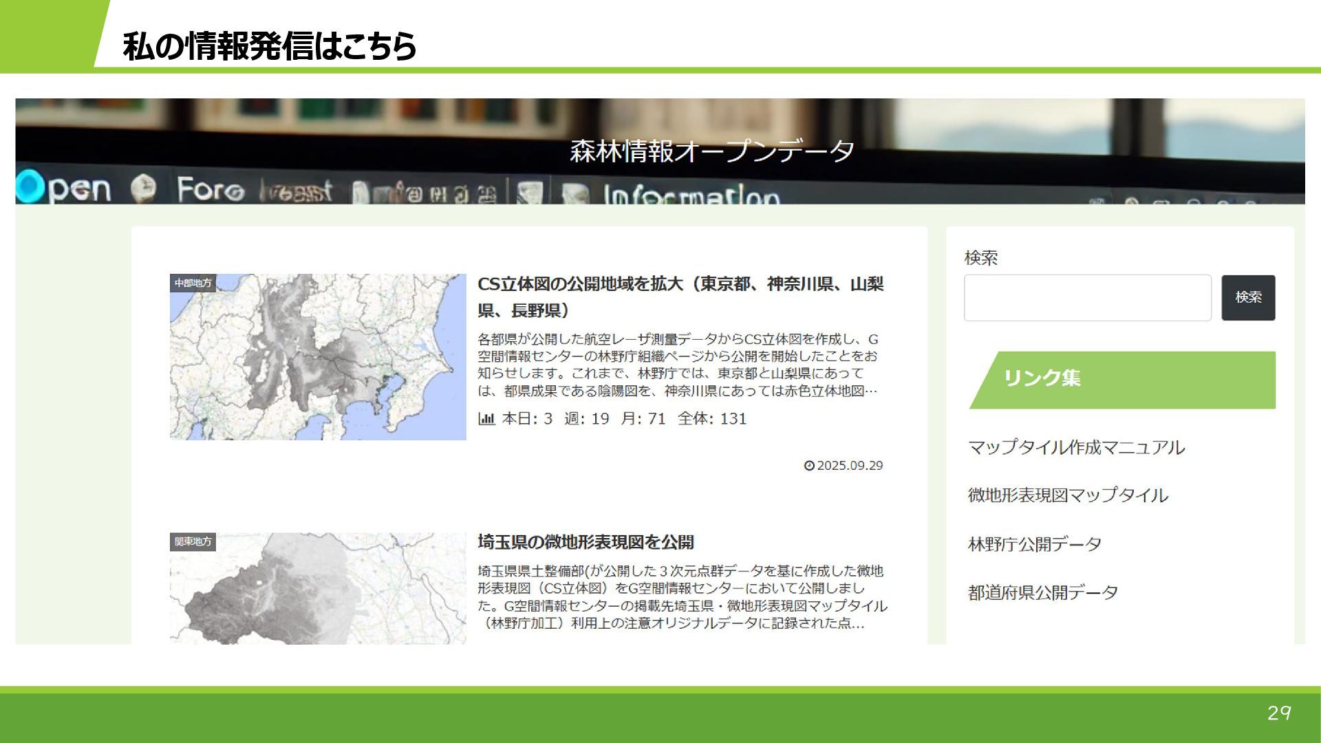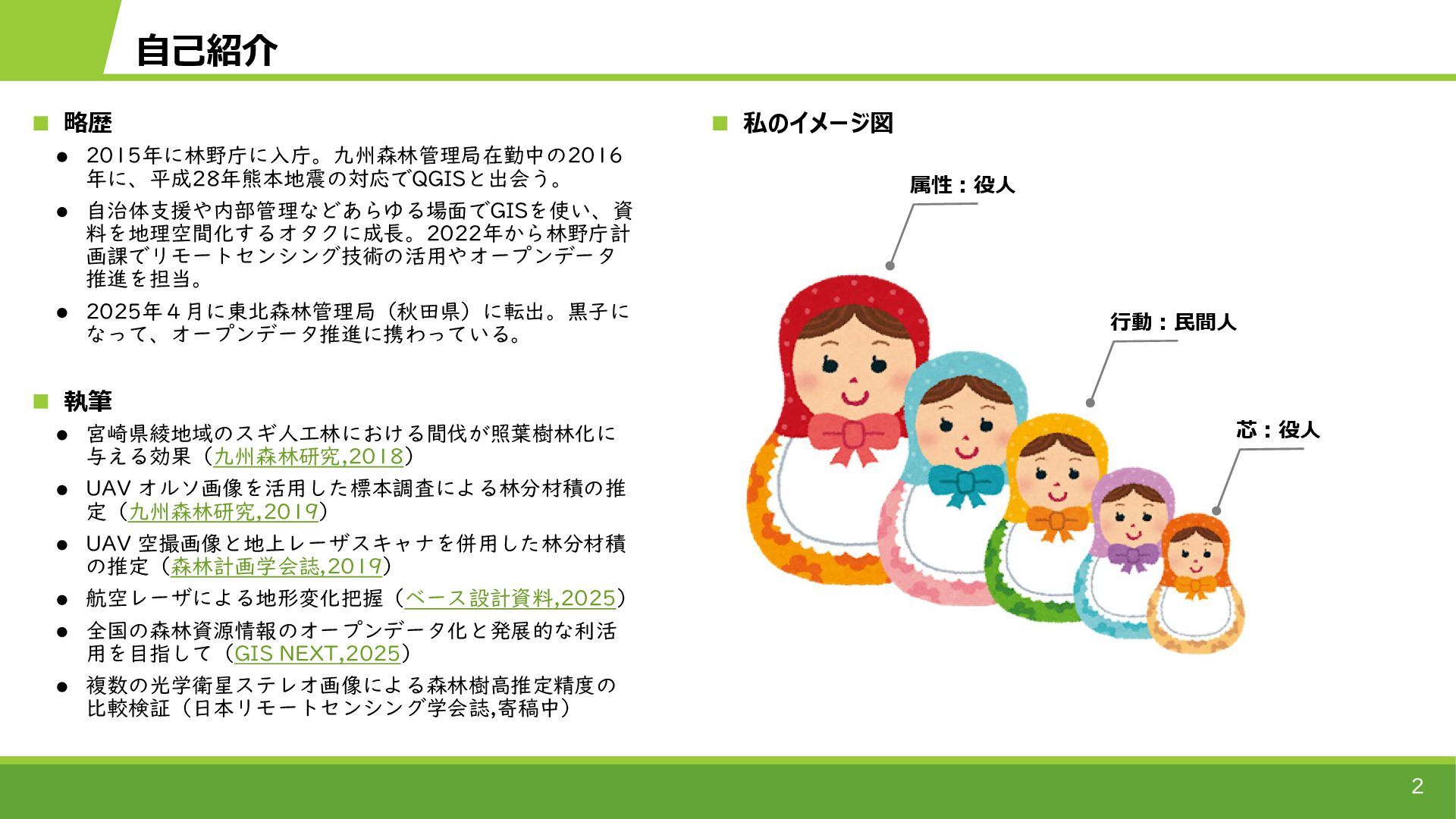 2025年4月に東北森林管理局(秋田県)に転出。黒子に なって、オープンデータ推進に携わっている。 執筆 宮崎県綾地域のスギ人工林における間伐が照葉樹林化に 与える効果(九州森林研究,2018) UAV オルソ画像を活用した標本調査による林分材積の推 定(九州森林研究,2019) UAV 空撮画像と地上レーザスキャナを併用した林分材積 の推定(森林計画学会誌,2019) 航空レーザによる地形変化把握(ベース設計資料,2025) 全国の森林資源情報のオープンデータ化と発展的な利活 用を目指して(GIS NEXT,2025) 複数の光学衛星ステレオ画像による森林樹高推定精度の 比較検証(日本リモートセンシング学会誌,寄稿中) 芯:役人 行動:民間人 属性:役人
