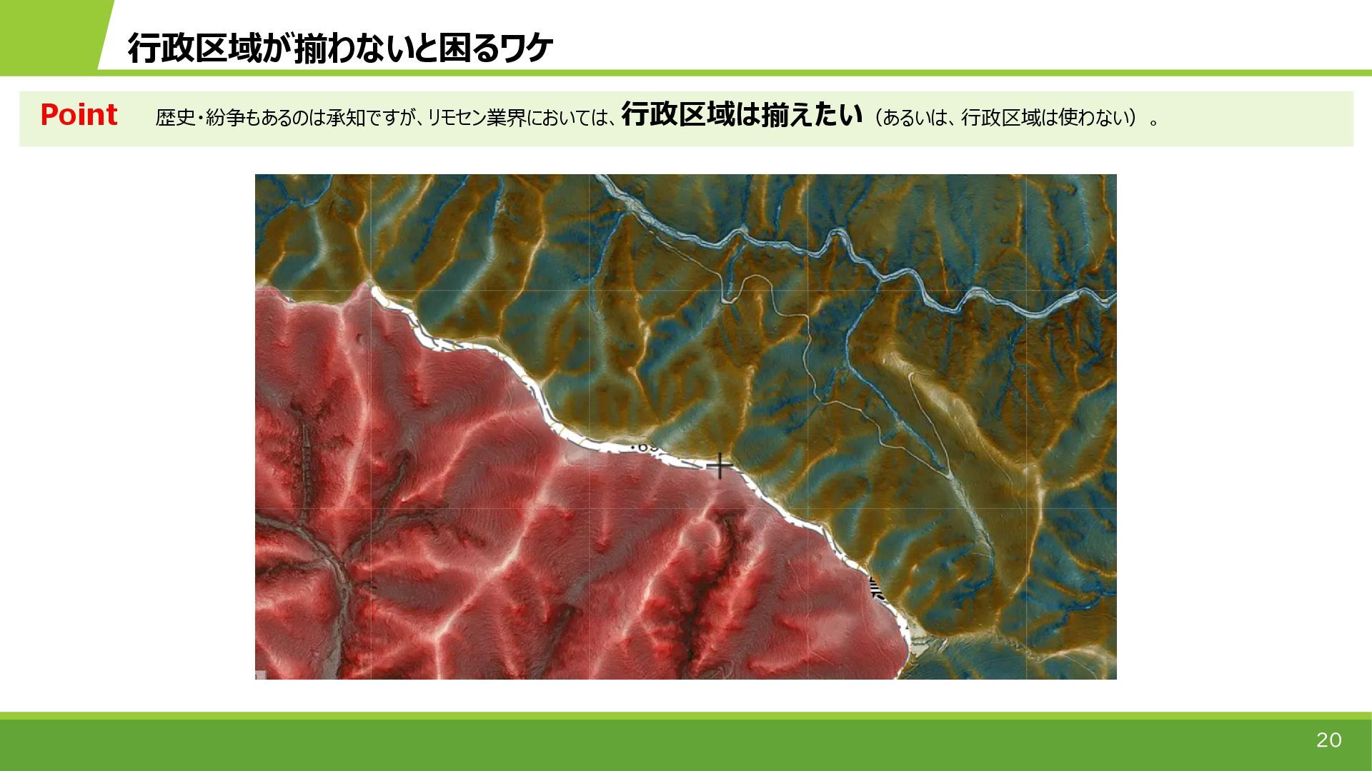行政区域が揃わないと困るワケ 20 Point 歴史・紛争もあるのは承知ですが、リモセン業界においては、行政区域は揃えたい(あるいは、行政区域は使わない)。