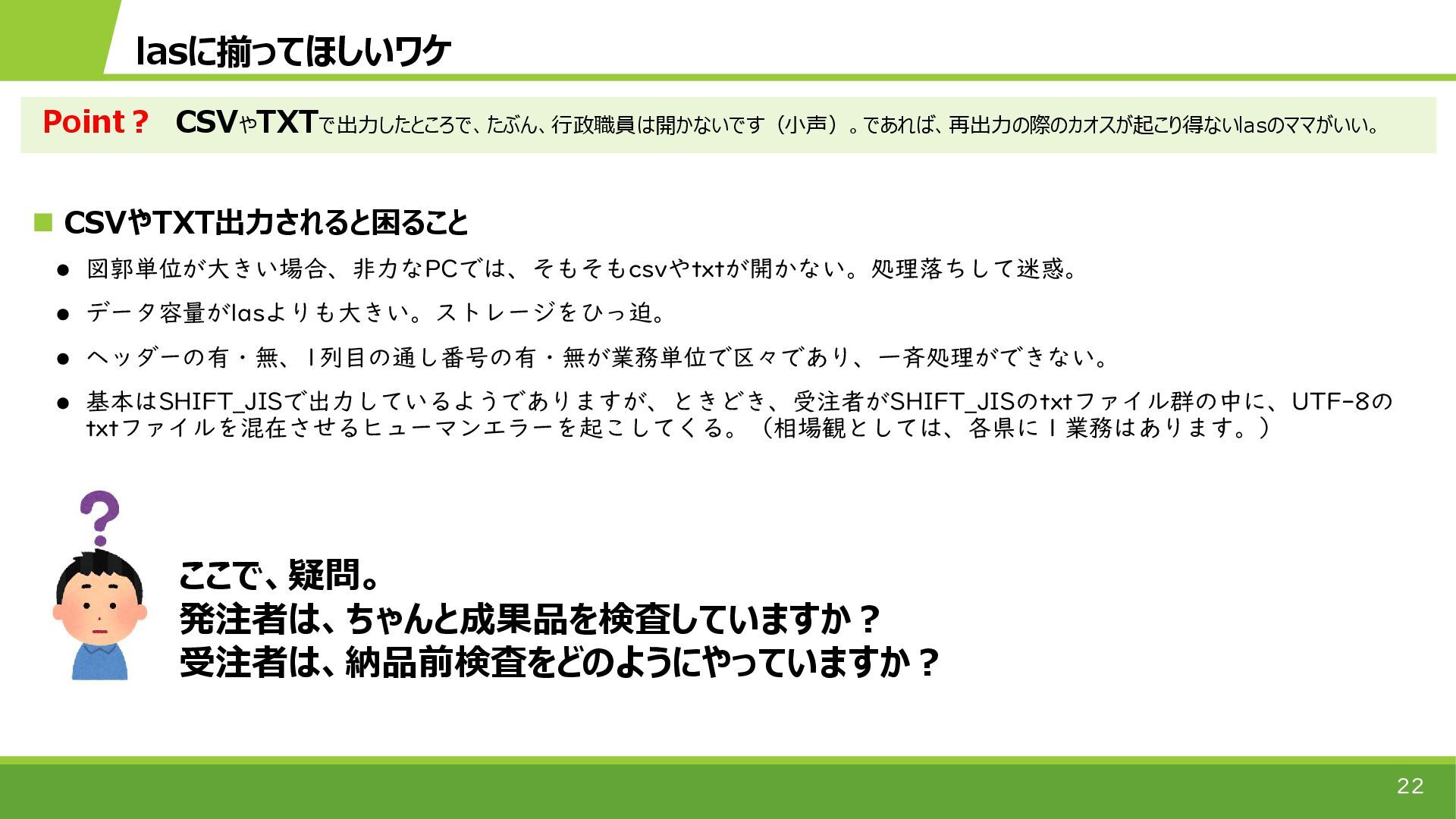 lasに揃ってほしいワケ 22 Point? CSVやTXTで出力したところで、たぶん、行政職員は開かないです(小声)。であれば、再出力の際のカオスが起こり得ないlasのママがいい。 CSVやTXT出力されると困ること 図郭単位が大きい場合、非力なPCでは、そもそもcsvやtxtが開かない。処理落ちして迷惑。 データ容量がlasよりも大きい。ストレージをひっ迫。 ヘッダーの有・無、1列目の通し番号の有・無が業務単位で区々であり、一斉処理ができない。 基本はSHIFT_JISで出力しているようでありますが、ときどき、受注者がSHIFT_JISのtxtファイル群の中に、UTF-8の txtファイルを混在させるヒューマンエラーを起こしてくる。(相場観としては、各県に1業務はあります。)