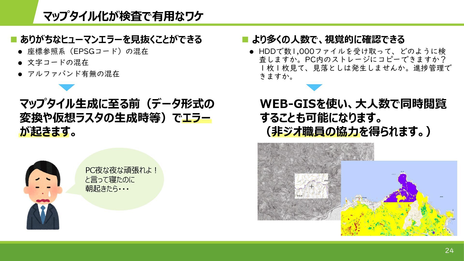 マップタイル化が検査で有用なワケ 24 より多くの人数で、視覚的に確認できる HDDで数1,000ファイルを受け取って、どのように検 査しますか。PC内のストレージにコピーできますか? 1枚1枚見て、見落としは発生しませんか。進捗管理で きますか。 ありがちなヒューマンエラーを見抜くことができる 座標参照系(EPSGコード)の混在 文字コードの混在
