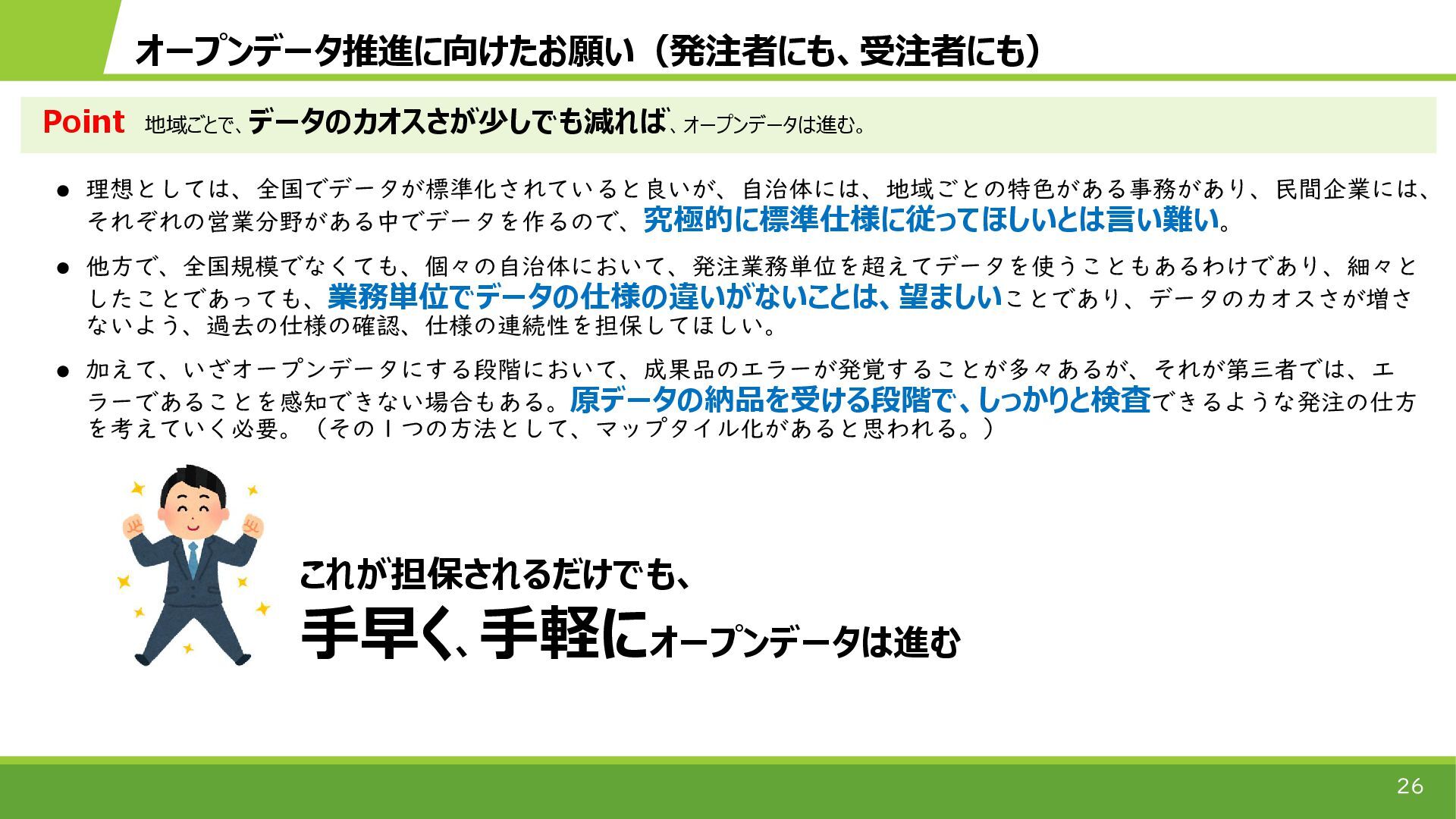 オープンデータ推進に向けたお願い(発注者にも、受注者にも) 26 理想としては、全国でデータが標準化されていると良いが、自治体には、地域ごとの特色がある事務があり、民間企業には、 それぞれの営業分野がある中でデータを作るので、究極的に標準仕様に従ってほしいとは言い難い。 他方で、全国規模でなくても、個々の自治体において、発注業務単位を超えてデータを使うこともあるわけであり、細々と したことであっても、業務単位でデータの仕様の違いがないことは、望ましいことであり、データのカオスさが増さ ないよう、過去の仕様の確認、仕様の連続性を担保してほしい。 加えて、いざオープンデータにする段階において、成果品のエラーが発覚することが多々あるが、それが第三者では、エ ラーであることを感知できない場合もある。原データの納品を受ける段階で、しっかりと検査できるような発注の仕方 を考えていく必要。(その1つの方法として、マップタイル化があると思われる。)