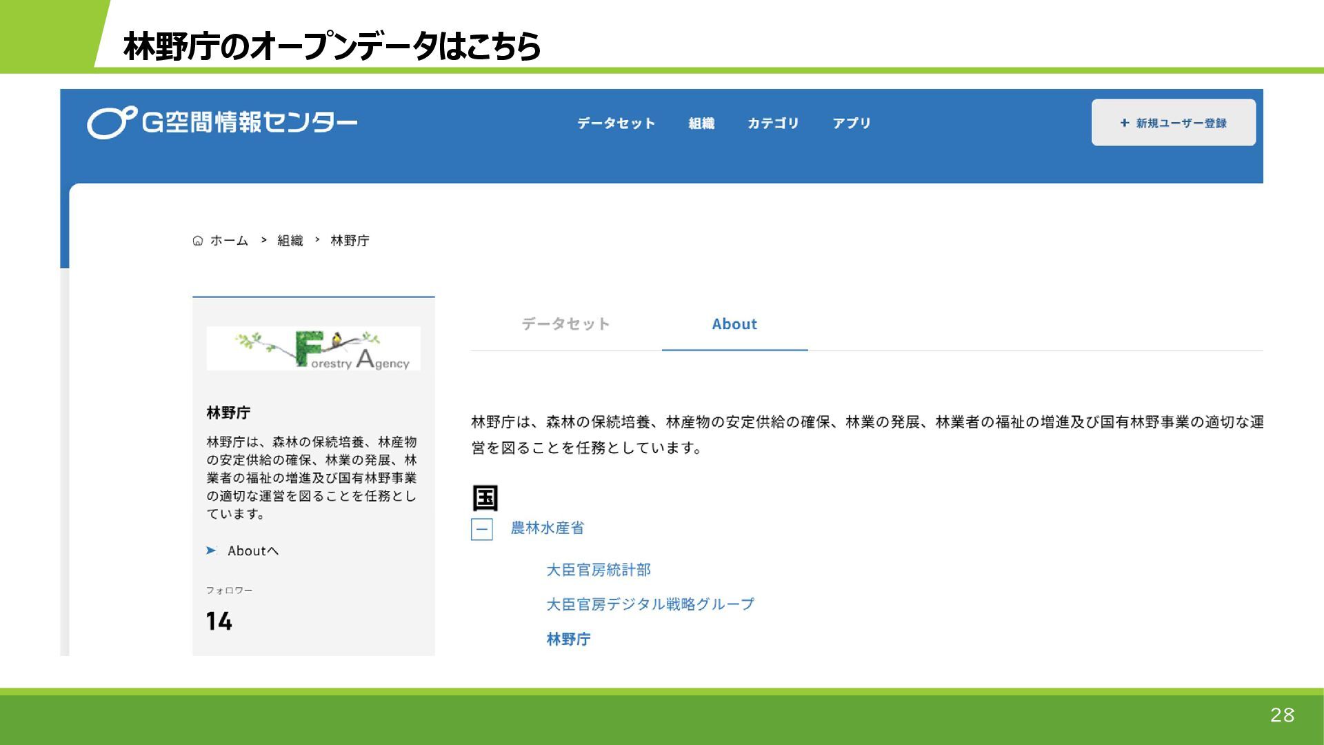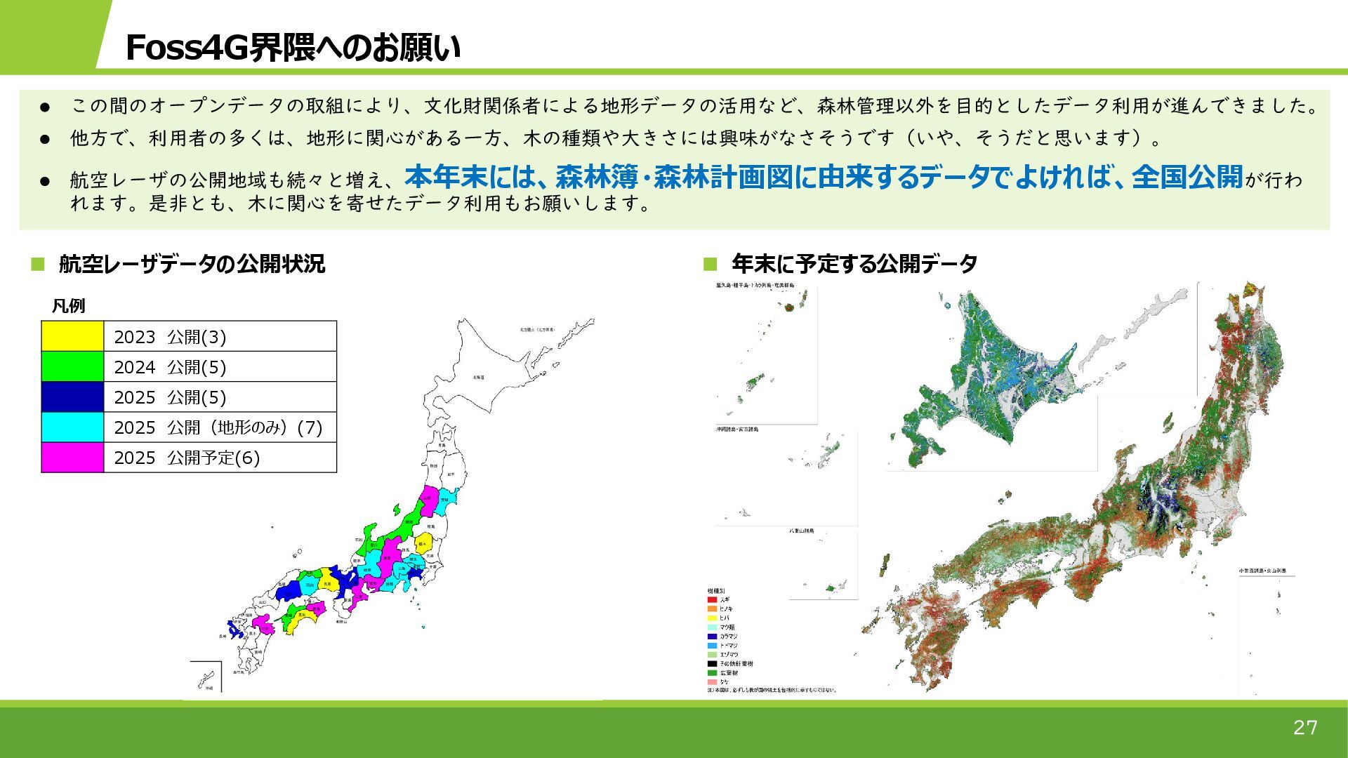 Foss4G界隈へのお願い 27 この間のオープンデータの取組により、文化財関係者による地形データの活用など、森林管理以外を目的としたデータ利用が進んできました。 他方で、利用者の多くは、地形に関心がある一方、木の種類や大きさには興味がなさそうです(いや、そうだと思います)。 航空レーザの公開地域も続々と増え、本年末には、森林簿・森林計画図に由来するデータでよければ、全国公開が行わ れます。是非とも、木に関心を寄せたデータ利用もお願いします。 年末に予定する公開データ 航空レーザデータの公開状況 凡例 2023