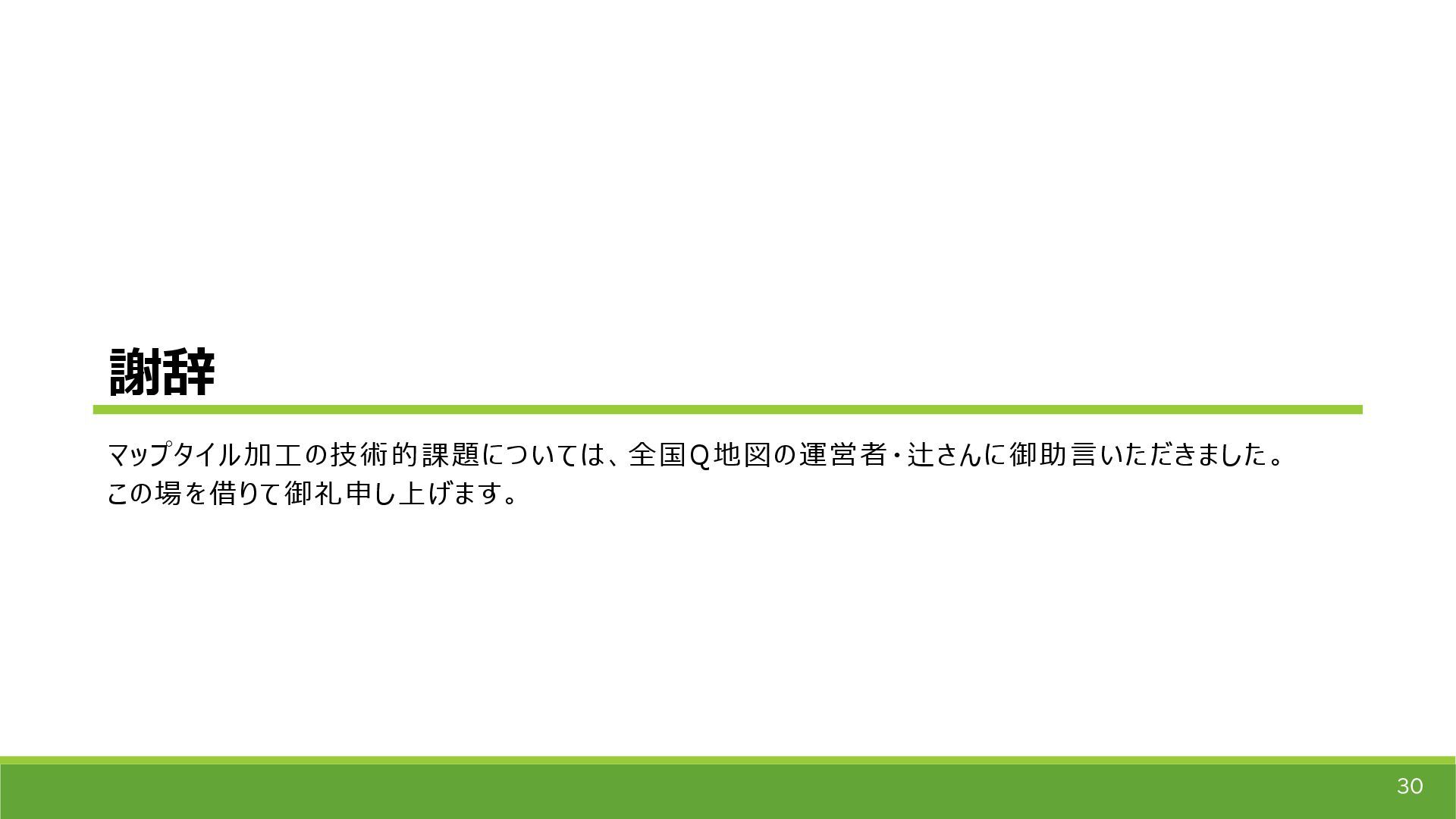 謝辞 30 マップタイル加工の技術的課題については、全国Q地図の運営者・辻さんに御助言いただきました。 この場を借りて御礼申し上げます。