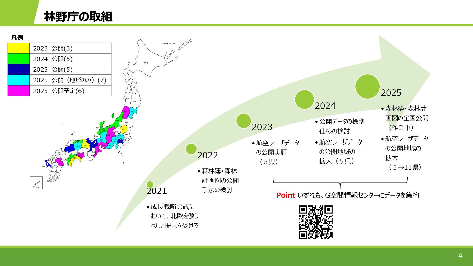 計画図の公開 手法の検討 2023 • 航空レーザデータ の公開実証 (3県) 2024 • 公開データの標準 仕様の検討 • 航空レーザデータ の公開地域の 拡大(5県) 2025 • 森林簿・森林計 画図の全国公開 (作業中) • 航空レーザデータ の公開地域の 拡大 (5→11県) 凡例 2023 公開(3) 2024 公開(5) 2025 公開(5) 2025 公開(地形のみ)(7) 2025 公開予定(6) Point いずれも、G空間情報センターにデータを集約