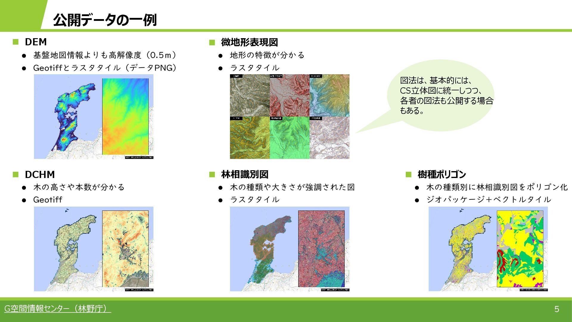 ラスタタイル DCHM 木の高さや本数が分かる Geotiff 樹種ポリゴン 木の種類別に林相識別図をポリゴン化 ジオパッケージ+ベクトルタイル 図法は、基本的には、 CS立体図に統一しつつ、 各者の図法も公開する場合 もある。 G空間情報センター(林野庁)
