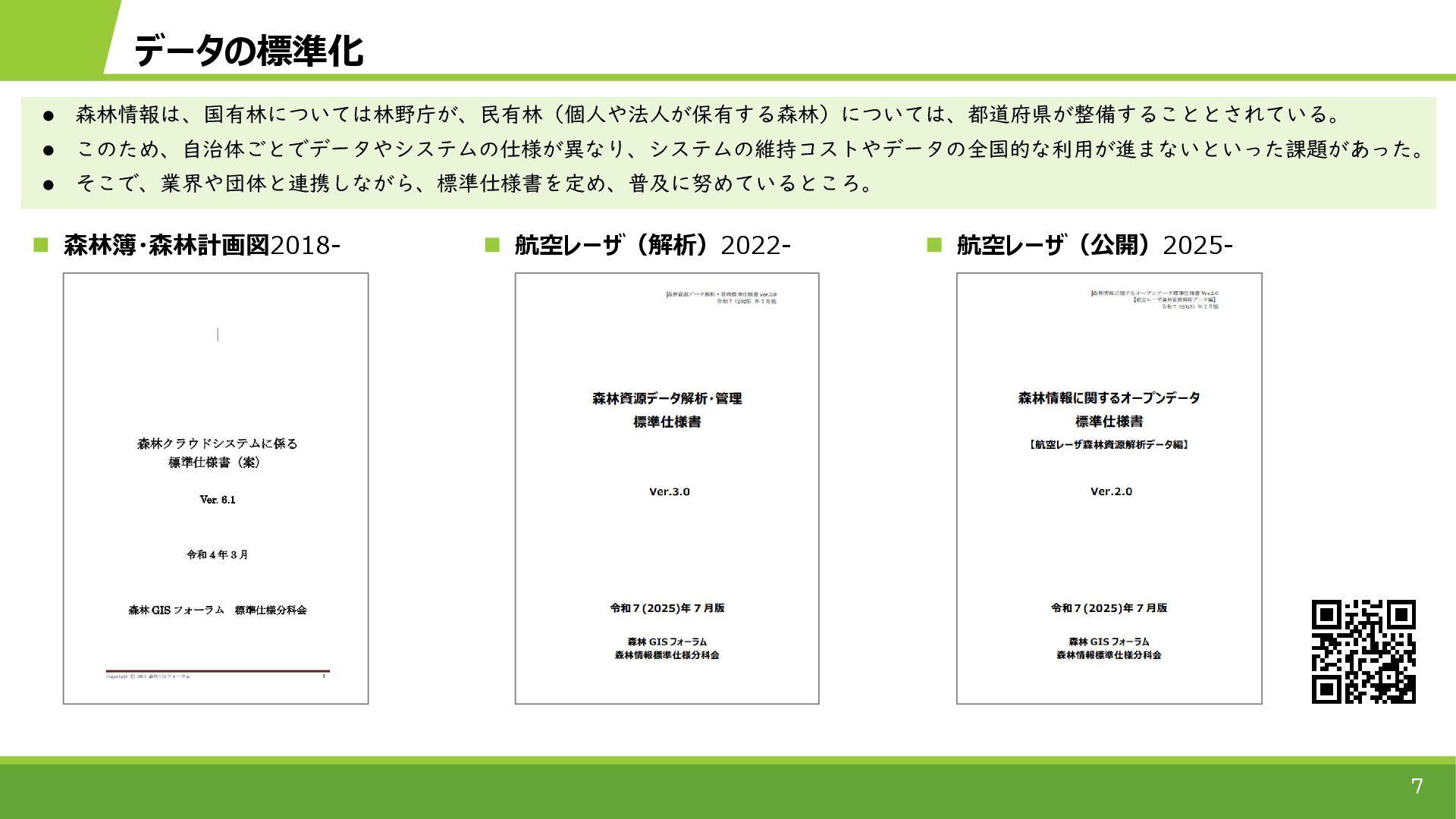 データの標準化 7 森林情報は、国有林については林野庁が、民有林(個人や法人が保有する森林)については、都道府県が整備することとされている。 このため、自治体ごとでデータやシステムの仕様が異なり、システムの維持コストやデータの全国的な利用が進まないといった課題があった。 そこで、業界や団体と連携しながら、標準仕様書を定め、普及に努めているところ。 航空レーザ(解析)2022- 森林簿・森林計画図2018- 航空レーザ(公開)2025-